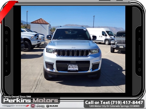 Factory MSRP: $49,295 $6,018 off MSRP! Priced below KBB Fair Purchase Price! Silver Zynith 2025 Jeep Grand Cherokee L Limited 4WD 8-Speed Automatic 3.6L V6 24V VVT<br><br>Check us out at www.perkinsmotors.com to see our specials! Since opening our doors in 1944, we’ve been proud to serve Colorado Springs, CO, and the surrounding areas of Pueblo, Castle Rock and Denver, CO. Throughout this time of being family owned for 80 years, we’ve maintained a firm commitment to our customers: to offer a wide selection of New Chrysler, Dodge, Fiat, Jeep, and Ram vehicles and quality pre-owned vehicles, and provide a quick, no-hassle car-buying process that ensures everyone drives off the lot satisfied with their purchase.<br><br>Quick Order Package 23E (DISC), 3.45 Rear Axle Ratio, 3rd row seats: split-bench, 4-Wheel Disc Brakes, 6 Speakers, ABS brakes, Active Noise Control System, Air Conditioning, Alloy wheels, AM/FM radio: SiriusXM with 360L, Anti-whiplash front head restraints, Audio memory, Auto High-beam Headlights, Automatic temperature control, Brake assist, Bumpers: body-color, Capri Leatherette Seats, Compass, Cruise Control, Delay-off headlights, Driver door bin, Driver vanity mirror, Dual front impact airbags, Dual front side impact airbags, Electronic Stability Control, Emergency communication system, Four wheel independent suspension, Front anti-roll bar, Front Bucket Seats, Front Center Armrest w/Storage, Front dual zone A/C, Front fog lights, Front License Plate Bracket, Front reading lights, Fully automatic headlights, Garage door transmitter, Heated door mirrors, Heated front seats, Heated rear seats, Heated steering wheel, Illuminated entry, Knee airbag, Low tire pressure warning, Manual Fold Seatbacks, Memory seat, Model Year Tracking, Navigation System, Normal Duty Suspension, Occupant sensing airbag, Outside temperature display, Overhead airbag, Overhead console, Panic alarm, ParkView Rear Back-Up Camera, Passenger door bin, Passenger vanity mirror, Power door mirrors, Power driver seat, Power Liftgate, Power passenger seat, Power steering, Power windows, Radio data system, Radio: Uconnect 5 Nav w/10.1 Display, Rear air conditioning, Rear anti-roll bar, Rear reading lights, Rear window defroster, Rear window wiper, Reclining 3rd row seat, Remote keyless entry, Security system, Speed-Sensitive Wipers, Split folding rear seat, Spoiler, Steering wheel mounted audio controls, Tachometer, Telescoping steering wheel, Tilt steering wheel, Traction control, Trip computer, Turn signal indicator mirrors, Variably intermittent wipers, Voltmeter, and Wheels: 18 x 8.0 Polished/Painted Aluminum.