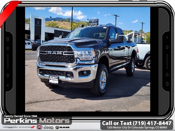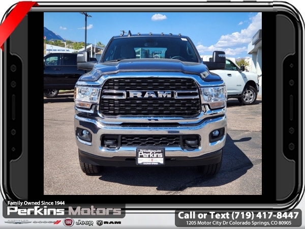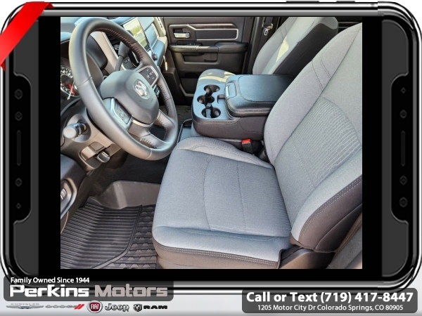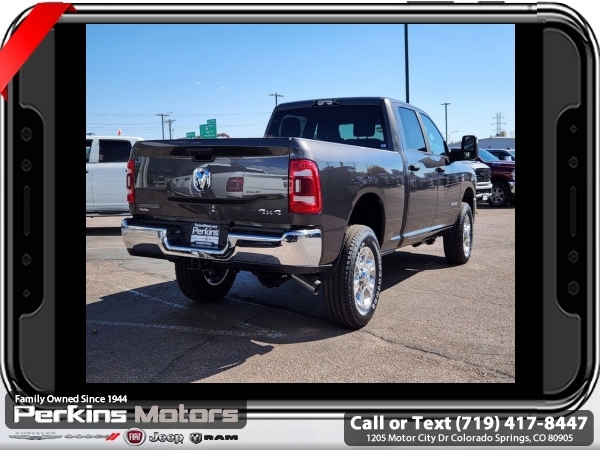 Factory MSRP: $74,085 $10,500 off MSRP! Granite Crystal Metallic Clearcoat 2024 Ram 2500 Big Horn 4WD 6-Speed Automatic Cummins 6.7L I6 Turbodiesel<br><br>Check us out at www.perkinsmotors.com to see our specials! Since opening our doors in 1944, we’ve been proud to serve Colorado Springs, CO, and the surrounding areas of Pueblo, Castle Rock and Denver, CO. Throughout this time of being family owned for 80 years, we’ve maintained a firm commitment to our customers: to offer a wide selection of New Chrysler, Dodge, Fiat, Jeep, and Ram vehicles and quality pre-owned vehicles, and provide a quick, no-hassle car-buying process that ensures everyone drives off the lot satisfied with their purchase.<br><br>Cold Weather Group (Engine Block Heater and MOPAR Winter Front Grille Cover), Heated Seats & Wheel Group (Heated Front Seats, Heated Steering Wheel, Leather Wrapped Steering Wheel, and Steering Wheel Mounted Audio Controls), Level 1 Equipment Group (2 Way Rear Headrest Seat, 2nd Row In Floor Storage Bins, 4 Way Front Headrests, 40/20/40 Split Bench Seat, 4G LTE Wi-Fi Hot Spot, 8.4 Touchscreen Display, Apple CarPlay, Auto Power-Folding Mirrors, Big Horn IP Badge, Black Exterior Mirrors, Bluetooth Handsfree Phone & Audio, Center Hub, Connectivity - US/Canada, Dual Glove Boxes, Exterior Mirrors Courtesy Lamps, Exterior Mirrors w/Heating Element, Exterior Mirrors w/Supplemental Signals, Foam Bottle Insert (Door Trim Panel), Footwell Courtesy Lamp, For Details, Visit DriveUconnect.com, For More Info, Call 800-643-2112, Forward & Reverse Utility Lights, Front Armrest w/Cupholders, Front Center Seat Cushion Storage, Front Fog Lamps, Front Seat Back Map Pockets, Global Telematics Box Module (TBM), Glove Box Lamp, Google Android Auto, GPS Antenna Input, Integrated Center Stack Radio, Integrated Voice Command w/Bluetooth, Locking Lower Glove Box, Manual Adjust 4-Way Front Passenger Seat, Mirror Running Lights, Power 2-Way Driver Lumbar Adjust, Power Adjust 8-Way Driver Seat, Power Adjust Mirrors, Power Adjustable Convex Aux Mirrors, Power Heated Fold Telescope Mirrors, Power Telescoping Mirrors, Rear 60/40 Folding Seat, Rear Dome w/On/Off Switch Lamp, Remote USB Port - Charge Only, Selectable Tire Fill Alert, SiriusXM Radio Service, SiriusXM Satellite Radio, Storage Tray, and Wheels: 18 x 8.0 Polished Aluminum), Off Road Package (Front Performance Tuned Shock Absorbers, Hill Descent Control, Rear Performance Tuned Shock Absorbers, and Tow Hooks), Quick Order Package 2HZ Big Horn, 220 Amp Alternator, 3.73 Axle Ratio, 4-Wheel Disc Brakes, 5th Wheel/Gooseneck Towing Prep Group, 6 Speakers, ABS brakes, Active Noise Control System, Air Conditioning, Air Conditioning ATC w/Dual Zone Control, Alexa Built-In, All R1 High Radios, All Radio Equipped Vehicles, Anti-Spin Differential Rear Axle, Blind Spot & Cross Path Detection, Brake assist, Bumpers: chrome, Center Stack Storage Drawer, Clearance Lamps, Cloth 40/20/40 Bench Seat, Compass, Connected Travel & Traffic Services, Cruise Control, CTR Stop Lamp w/Cargo View Camera, Dash Pass Thru Wire Circuits, Delay-off headlights, Disassociated Touchscreen Display, Driver door bin, Dual front impact airbags, Dual front side impact airbags, Electronic Stability Control, Electronically Controlled Throttle, Emergency communication system: SiriusXM Guardian, Front anti-roll bar, Front Center Armrest w/Storage, Front License Plate Bracket, Front reading lights, Fully automatic headlights, GPS Navigation, HD Radio, Heated door mirrors, I/P Mounted Auxiliary Switches, Illuminated entry, LED Tail Lamps, Low tire pressure warning, Manual Adjust 4-Way Driver Seat, Manufacturer's Statement of Origin, MOPAR Front & Rear Rubber Floor Mats, MOPAR Spray In Bedliner, Occupant sensing airbag, Off-Road Information Pages, Outsi Sale price includes all manufacture's incentives and dealer discounts. Sale price not available on lease or compatible with special APR. $2500 - 2024 National Truck Month Bonus Cash. Exp. 0