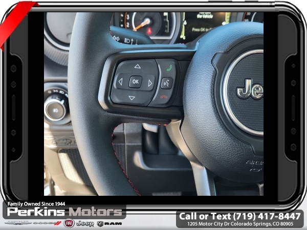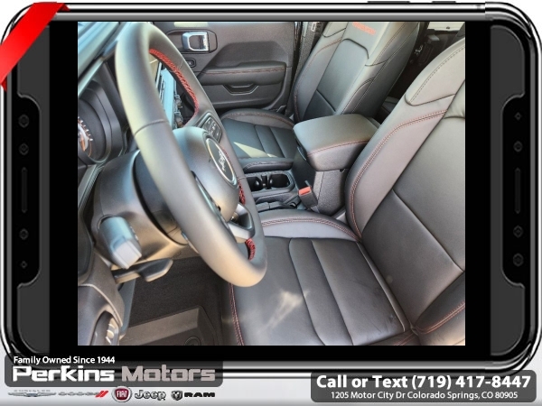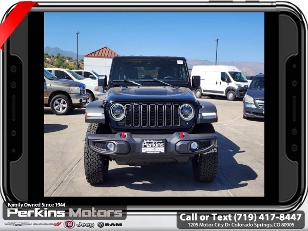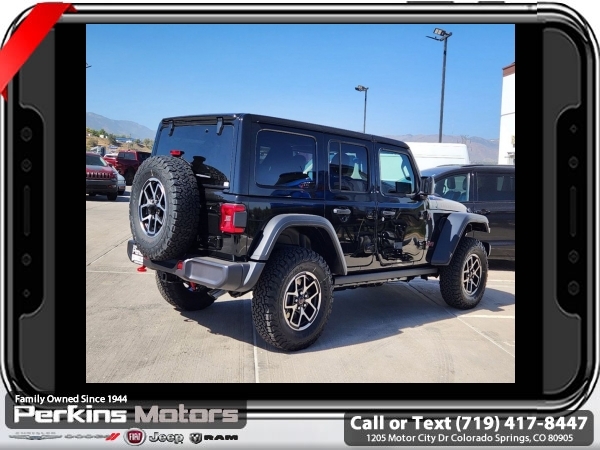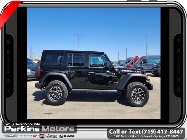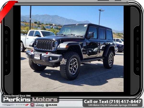 Factory MSRP: $61,340 $11,634 off MSRP! Priced below KBB Fair Purchase Price! Black Clearcoat 2024 Jeep Wrangler Rubicon 4WD 8-Speed Automatic 2.0L I4 DOHC<br><br>Check us out at www.perkinsmotors.com to see our specials! Since opening our doors in 1944, we’ve been proud to serve Colorado Springs, CO, and the surrounding areas of Pueblo, Castle Rock and Denver, CO. Throughout this time of being family owned for 80 years, we’ve maintained a firm commitment to our customers: to offer a wide selection of New Chrysler, Dodge, Fiat, Jeep, and Ram vehicles and quality pre-owned vehicles, and provide a quick, no-hassle car-buying process that ensures everyone drives off the lot satisfied with their purchase.<br><br>Convenience Group (Heated Front Seats, Heated Steering Wheel, and Remote Start System), Quick Order Package 22R Rubicon, 12.3 Touchscreen Display, 4-Wheel Disc Brakes, 4.10 Rear Axle Ratio, 8 Speakers, 97 MPH Vehicle Max Speed Calibration, ABS brakes, Air Conditioning, Alloy wheels, AM/FM radio: SiriusXM, Apple CarPlay, Apple CarPlay/Android Auto, Automatic temperature control, Aux Battery, Body Color 3-Piece Hard Top, Brake assist, Cloth Low-Back Bucket Seats, Compass, Connectivity - US/Canada, Cruise Control, Delay-off headlights, Disassociated Touchscreen Display, Driver door bin, Driver vanity mirror, Dual front impact airbags, Dual front side impact airbags, Electronic Stability Control, Emergency communication system: Jeep Connect, Front anti-roll bar, Front Bucket Seats, Front Center Armrest w/Storage, Front dual zone A/C, Front fog lights, Front License Plate Bracket, Front reading lights, Fully automatic headlights, Google Android Auto, Heated door mirrors, Illuminated entry, Integrated Center Stack Radio, Integrated roll-over protection, Integrated Voice Command w/Bluetooth, Low tire pressure warning, MOPAR All-Weather Floor Mats, Non-Lock Fuel Cap w/o Discriminator, Occupant sensing airbag, Outside temperature display, Overhead airbag, Panic alarm, ParkView Rear Back-Up Camera, Passenger door bin, Passenger vanity mirror, Performance Suspension, Power door mirrors, Power steering, Power windows, Radio data system, Radio: Uconnect 5 w/12.3 Display, Rear anti-roll bar, Rear reading lights, Remote keyless entry, Security system, Split folding rear seat, Steering wheel mounted audio controls, Stop-Start Dual Battery System, Tachometer, Telescoping steering wheel, Tilt steering wheel, Traction control, Trip computer, Variably intermittent wipers, Voltmeter, and Wheels: 17 x 7.5 Machined/Painted Black. Sale price includes all manufacture's incentives and dealer discounts. Sale price not available on lease or compatible with special APR. 10% Msrp - 2024 National Standalone 10% Below MSRP (1/B/L/E). Exp. 04/30/2025