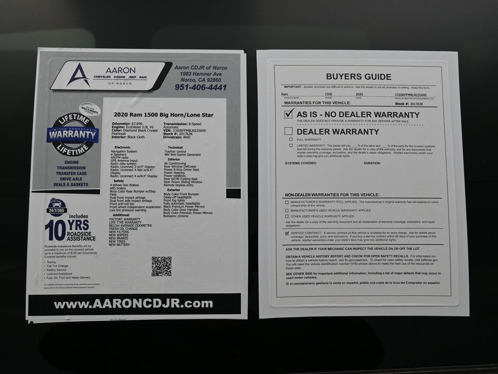Priced below KBB Fair Purchase Price!LIFE TIME WARRANTY, FRESH OIL CHANGE, NEW FILTERS, NEW WIPERS, 1500 Big Horn/Lone Star, 4D Crew Cab, EcoDiesel 3.0L V6, 8-Speed Automatic, 4WD, 20" x 9" Aluminum Wheels, 2nd Row In Floor Storage Bins, 3 Rear Seat Head Restraints, 4 Way Front Headrests, Auto-Dimming Rear-View Mirror, Big Horn IP Badge, Big Horn Level 1 Equipment Group, Black Interior Accents, Black Premium Power Mirrors, Body Color Door Handles, Body Color Front Bumper, Body Color Premium Power Mirrors, Body Color Rear Bumper w/Step Pads, Bucket Seats, Class IV Receiver Hitch, Cluster 3.5" TFT Color Display, Deluxe Cloth Bucket Seats, Foam Bottle Insert (Door Trim Panel), Front fog lights, Front Seat Back Map Pockets, Full Length Floor Console, Glove Box Lamp, Grille Surround 1 Body Color Texture 2 Black, Low tire pressure warning, Manual Adjust 4-Way Front Passenger Seat, Navigation System, Overhead airbag, ParkView Rear Back-Up Camera, Power 4-Way Driver Lumbar Adjust, Power 8-Way Driver Seat, Power Adjustable Pedals, Radio: Uconnect 4 Nav w/8.4" Display, Radio: Uconnect 4 w/8.4" Display, Rear 60/40 Folding Seat, Rear Dome w/On/Off Switch Lamp, Rear Power Sliding Window, Rear Window Defroster, SiriusXM Satellite Radio, Sport Appearance Package, Sport Decal, Sun Visors w/Illuminated Vanity Mirrors, Universal Garage Door Opener.For help with any Vehicle needs please call us directly at 951-621-1288.Clean CARFAX.