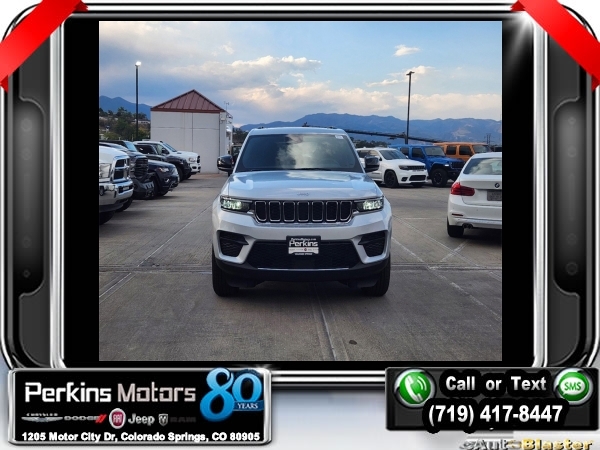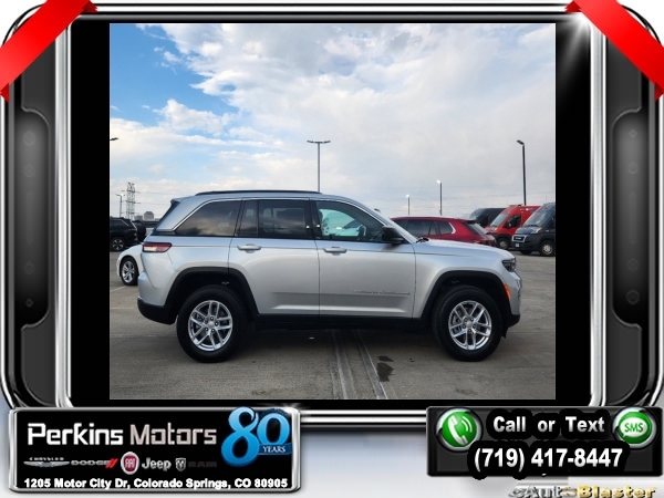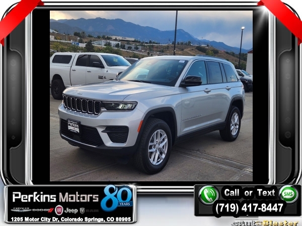 Factory MSRP: $42,175 $1,500 off MSRP! Silver Zynith 2025 Jeep Grand Cherokee Laredo 4WD 8-Speed Automatic 3.6L V6 24V VVT<br>4WD.<br>Check us out at www.perkinsmotors.com to see our specials! Since opening our doors in 1944, we’ve been proud to serve Colorado Springs, CO, and the surrounding areas of Pueblo, Castle Rock and Denver, CO. Throughout this time of being family owned for 80 years, we’ve maintained a firm commitment to our customers: to offer a wide selection of New Chrysler, Dodge, Fiat, Jeep, and Ram vehicles and quality pre-owned vehicles, and provide a quick, no-hassle car-buying process that ensures everyone drives off the lot satisfied with their purchase.<br><br>Quick Order Package 23D Laredo X (Power Sunroof and Wheels: 18 x 8 Fully Painted Aluminum), 4WD, 4-Wheel Disc Brakes, 6 Speakers, ABS brakes, Air Conditioning, Alloy wheels, Anti-whiplash front head restraints, Automatic temperature control, Brake assist, Bumpers: body-color, Cloth Seats, Compass, Cruise Control, Delay-off headlights, Driver door bin, Driver vanity mirror, Dual front impact airbags, Dual front side impact airbags, Electronic Stability Control, Emergency communication system, Four wheel independent suspension, Front anti-roll bar, Front Bucket Seats, Front Center Armrest w/Storage, Front dual zone A/C, Front License Plate Bracket, Front reading lights, Fully automatic headlights, Heated door mirrors, Illuminated entry, Knee airbag, Low tire pressure warning, Model Year Tracking, Normal Duty Suspension, Occupant sensing airbag, Outside temperature display, Overhead airbag, Overhead console, Panic alarm, ParkView Rear Back-Up Camera, Passenger door bin, Passenger vanity mirror, Power door mirrors, Power driver seat, Power steering, Power windows, Radio data system, Radio: Uconnect 5 w/8.4 Display, Rear anti-roll bar, Rear reading lights, Rear window defroster, Rear window wiper, Remote keyless entry, Roof rack: rails only, Security system, Speed-Sensitive Wipers, Split folding rear seat, Spoiler, Steering wheel mounted audio controls, Tachometer, Telescoping steering wheel, Tilt steering wheel, Traction control, Trip computer, Variably intermittent wipers, Voltmeter, and Wheels: 17 x 6.5 Fully Painted Aluminum.<br><br>19/26 City/Highway MPG