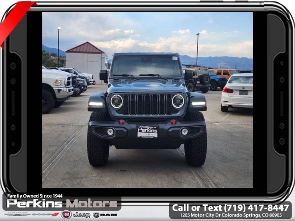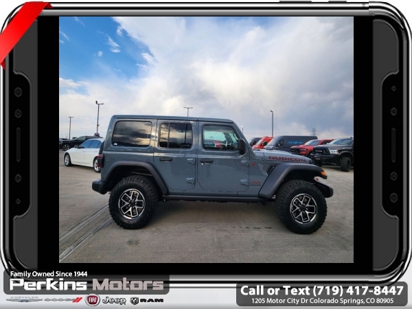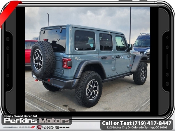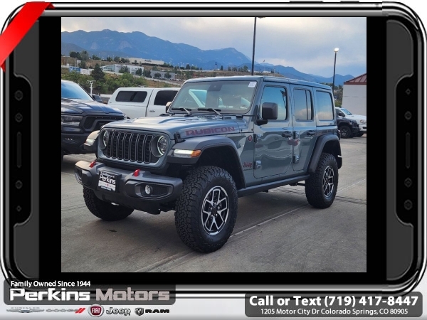 Factory MSRP: $59,540 $10,954 off MSRP! Priced below KBB Fair Purchase Price! Anvil Clear Coat 2024 Jeep Wrangler Rubicon 4WD 8-Speed Automatic 2.0L I4 DOHC<br><br>Check us out at www.perkinsmotors.com to see our specials! Since opening our doors in 1944, we’ve been proud to serve Colorado Springs, CO, and the surrounding areas of Pueblo, Castle Rock and Denver, CO. Throughout this time of being family owned for 80 years, we’ve maintained a firm commitment to our customers: to offer a wide selection of New Chrysler, Dodge, Fiat, Jeep, and Ram vehicles and quality pre-owned vehicles, and provide a quick, no-hassle car-buying process that ensures everyone drives off the lot satisfied with their purchase.<br><br>Convenience Group (Heated Front Seats, Heated Steering Wheel, and Remote Start System), Quick Order Package 22R Rubicon, 12.3 Touchscreen Display, 4-Wheel Disc Brakes, 4.10 Rear Axle Ratio, 8 Speakers, 97 MPH Vehicle Max Speed Calibration, ABS brakes, Air Conditioning, Alloy wheels, AM/FM radio: SiriusXM, Apple CarPlay, Apple CarPlay/Android Auto, Automatic temperature control, Aux Battery, Body Color 3-Piece Hard Top, Brake assist, Cloth Low-Back Bucket Seats, Compass, Connectivity - US/Canada, Cruise Control, Delay-off headlights, Disassociated Touchscreen Display, Driver door bin, Driver vanity mirror, Dual front impact airbags, Dual front side impact airbags, Electronic Stability Control, Emergency communication system: Jeep Connect, Front anti-roll bar, Front Bucket Seats, Front Center Armrest w/Storage, Front dual zone A/C, Front fog lights, Front License Plate Bracket, Front reading lights, Fully automatic headlights, Google Android Auto, Heated door mirrors, Illuminated entry, Integrated Center Stack Radio, Integrated roll-over protection, Integrated Voice Command w/Bluetooth, Jeep Trail Rated Kit, Low tire pressure warning, MOPAR All-Weather Floor Mats, Non-Lock Fuel Cap w/o Discriminator, Occupant sensing airbag, Outside temperature display, Overhead airbag, Panic alarm, ParkView Rear Back-Up Camera, Passenger door bin, Passenger vanity mirror, Performance Suspension, Power door mirrors, Power steering, Power windows, Radio data system, Radio: Uconnect 5 w/12.3 Display, Rear anti-roll bar, Rear reading lights, Remote keyless entry, Security system, Split folding rear seat, Steering wheel mounted audio controls, Stop-Start Dual Battery System, Tachometer, Telescoping steering wheel, Tilt steering wheel, Traction control, Trip computer, Variably intermittent wipers, Voltmeter, and Wheels: 17 x 7.5 Machined/Painted Black. Sale price includes all manufacture's incentives and dealer discounts. Sale price not available on lease or compatible with special APR. 10% Msrp - 2024 National Standalone 10% Below MSRP (1/B/L/E). Exp. 03/31/2025
