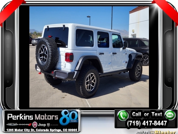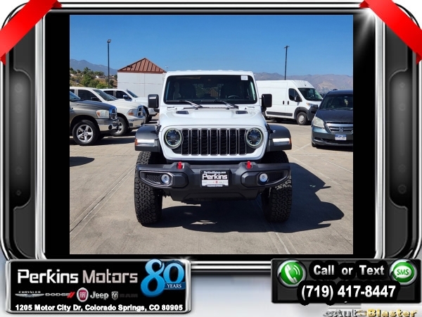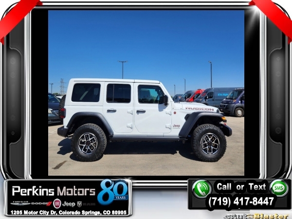Factory MSRP: $60,945 $14,000 off MSRP! Priced below KBB Fair Purchase Price! Bright White Clearcoat 2024 Jeep Wrangler Rubicon 4WD 8-Speed Automatic 3.6L V6 24V VVT<br><br>Check us out at www.perkinsmotors.com to see our specials! Since opening our doors in 1944, we’ve been proud to serve Colorado Springs, CO, and the surrounding areas of Pueblo, Castle Rock and Denver, CO. Throughout this time of being family owned for 80 years, we’ve maintained a firm commitment to our customers: to offer a wide selection of New Chrysler, Dodge, Fiat, Jeep, and Ram vehicles and quality pre-owned vehicles, and provide a quick, no-hassle car-buying process that ensures everyone drives off the lot satisfied with their purchase.<br><br>Convenience Group, Quick Order Package 24R Rubicon, 12.3 Touchscreen Display, 4-Wheel Disc Brakes, 4.10 Rear Axle Ratio, 8 Speakers, 97 MPH Vehicle Max Speed Calibration, ABS brakes, Air Conditioning, Alloy wheels, AM/FM radio: SiriusXM, Apple CarPlay, Apple CarPlay/Android Auto, Automatic temperature control, Aux Battery, Body Color 3-Piece Hard Top, Brake assist, Cloth Low-Back Bucket Seats, Compass, Connectivity - US/Canada, Cruise Control, Delay-off headlights, Disassociated Touchscreen Display, Driver door bin, Driver vanity mirror, Dual front impact airbags, Dual front side impact airbags, Electronic Stability Control, Emergency communication system: Jeep Connect, Front anti-roll bar, Front Bucket Seats, Front Center Armrest w/Storage, Front dual zone A/C, Front fog lights, Front License Plate Bracket, Front reading lights, Fully automatic headlights, Google Android Auto, Heated door mirrors, Illuminated entry, Integrated Center Stack Radio, Integrated roll-over protection, Integrated Voice Command w/Bluetooth, Jeep Trail Rated Kit, Low tire pressure warning, MOPAR All-Weather Floor Mats, Non-Lock Fuel Cap w/o Discriminator, Occupant sensing airbag, Outside temperature display, Overhead airbag, Panic alarm, ParkView Rear Back-Up Camera, Passenger door bin, Passenger vanity mirror, Performance Suspension, Power door mirrors, Power steering, Power windows, Radio data system, Radio: Uconnect 5 w/12.3 Display, Rear anti-roll bar, Rear reading lights, Remote keyless entry, Security system, Split folding rear seat, Steering wheel mounted audio controls, Stop-Start Dual Battery System, Tachometer, Telescoping steering wheel, Tilt steering wheel, Traction control, Trip computer, Variably intermittent wipers, Voltmeter, and Wheels: 17 x 7.5 Machined/Painted Black. Sale price includes all manufacture's incentives and dealer discounts. Sale price not available on lease or compatible with special APR. $3000 - 2024 Bonus Cash . Exp. 10/31/2024
