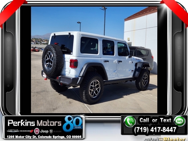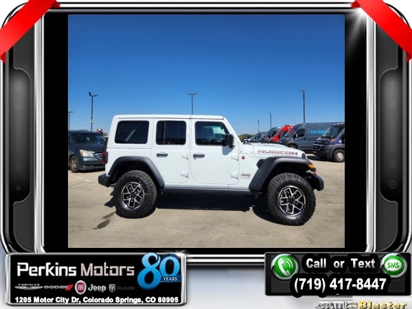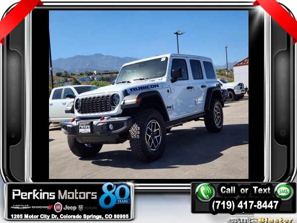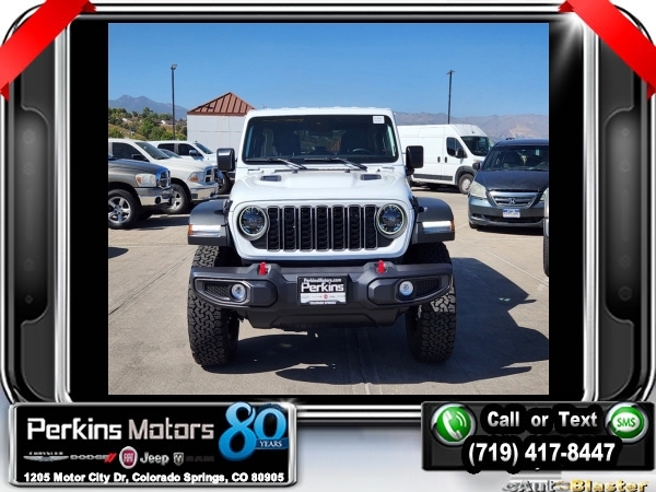 Factory MSRP: $58,945 $14,000 off MSRP! Priced below KBB Fair Purchase Price! Bright White Clearcoat 2024 Jeep Wrangler Rubicon 4WD 8-Speed Automatic 2.0L I4 DOHC<br><br>Check us out at www.perkinsmotors.com to see our specials! Since opening our doors in 1944, we’ve been proud to serve Colorado Springs, CO, and the surrounding areas of Pueblo, Castle Rock and Denver, CO. Throughout this time of being family owned for 80 years, we’ve maintained a firm commitment to our customers: to offer a wide selection of New Chrysler, Dodge, Fiat, Jeep, and Ram vehicles and quality pre-owned vehicles, and provide a quick, no-hassle car-buying process that ensures everyone drives off the lot satisfied with their purchase.<br><br>Convenience Group, Quick Order Package 22R Rubicon, 12.3 Touchscreen Display, 4-Wheel Disc Brakes, 4.10 Rear Axle Ratio, 8 Speakers, 97 MPH Vehicle Max Speed Calibration, ABS brakes, Air Conditioning, Alloy wheels, AM/FM radio: SiriusXM, Apple CarPlay, Apple CarPlay/Android Auto, Automatic temperature control, Aux Battery, Body Color 3-Piece Hard Top, Brake assist, Cloth Low-Back Bucket Seats, Compass, Connectivity - US/Canada, Cruise Control, Delay-off headlights, Disassociated Touchscreen Display, Driver door bin, Driver vanity mirror, Dual front impact airbags, Dual front side impact airbags, Electronic Stability Control, Emergency communication system: Jeep Connect, Front anti-roll bar, Front Bucket Seats, Front Center Armrest w/Storage, Front dual zone A/C, Front fog lights, Front License Plate Bracket, Front reading lights, Fully automatic headlights, Google Android Auto, Heated door mirrors, Illuminated entry, Integrated Center Stack Radio, Integrated roll-over protection, Integrated Voice Command w/Bluetooth, Jeep Trail Rated Kit, Low tire pressure warning, MOPAR All-Weather Floor Mats, Non-Lock Fuel Cap w/o Discriminator, Occupant sensing airbag, Outside temperature display, Overhead airbag, Panic alarm, ParkView Rear Back-Up Camera, Passenger door bin, Passenger vanity mirror, Performance Suspension, Power door mirrors, Power steering, Power windows, Radio data system, Radio: Uconnect 5 w/12.3 Display, Rear anti-roll bar, Rear reading lights, Remote keyless entry, Security system, Split folding rear seat, Steering wheel mounted audio controls, Stop-Start Dual Battery System, Tachometer, Telescoping steering wheel, Tilt steering wheel, Traction control, Trip computer, Variably intermittent wipers, Voltmeter, and Wheels: 17 x 7.5 Machined/Painted Black. Sale price includes all manufacture's incentives and dealer discounts. Sale price not available on lease or compatible with special APR. $3000 - 2024 Bonus Cash . Exp. 10/31/2024