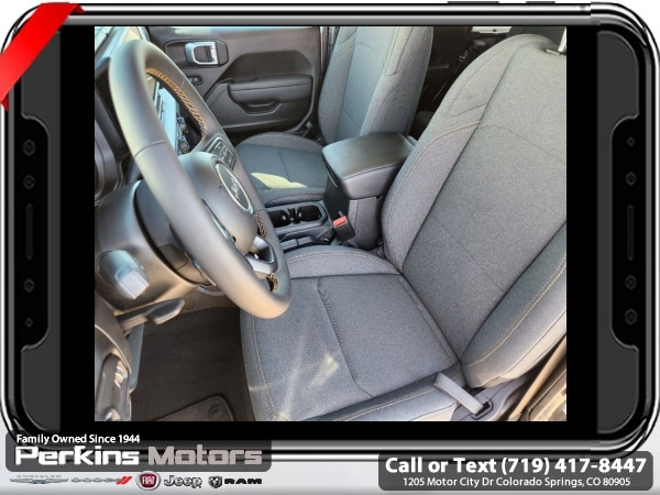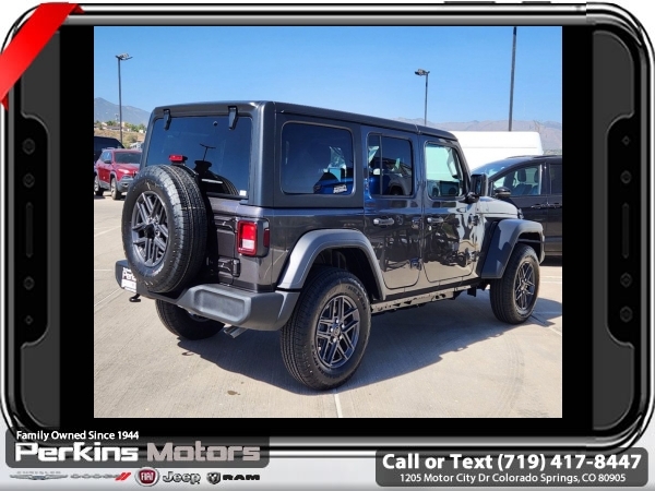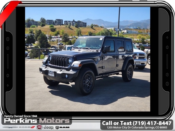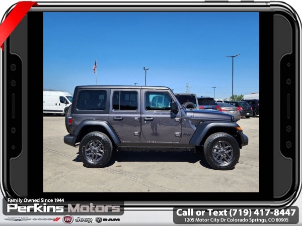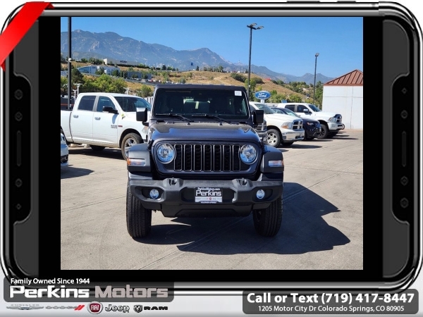 Factory MSRP: $50,775 $10,295 off MSRP! Granite Crystal Metallic Clearcoat 2024 Jeep Wrangler Sport S 4WD 8-Speed Automatic 3.6L V6 24V VVT<br><br>Check us out at www.perkinsmotors.com to see our specials! Since opening our doors in 1944, we’ve been proud to serve Colorado Springs, CO, and the surrounding areas of Pueblo, Castle Rock and Denver, CO. Throughout this time of being family owned for 80 years, we’ve maintained a firm commitment to our customers: to offer a wide selection of New Chrysler, Dodge, Fiat, Jeep, and Ram vehicles and quality pre-owned vehicles, and provide a quick, no-hassle car-buying process that ensures everyone drives off the lot satisfied with their purchase.<br><br>Convenience Group (Heated Steering Wheel), Quick Order Package 24S Sport S (Power Heated Mirrors, Security Alarm, and Wheels: 17 x 7.5 Gray), 110 MPH Vehicle Max Speed Calibration, 3.45 Overall Top Gear Ratio, 4-Wheel Disc Brakes, 8 Speakers, ABS brakes, Air Conditioning, AM/FM radio, Apple CarPlay/Android Auto, Aux Battery, Black 3-Piece Hard Top, Brake assist, Cloth Low-Back Bucket Seats, Compass, Cruise Control, Delay-off headlights, Driver door bin, Driver vanity mirror, Dual front impact airbags, Dual front side impact airbags, Electronic Stability Control, Freedom Panel Storage Bag, Front anti-roll bar, Front Bucket Seats, Front Center Armrest w/Storage, Front fog lights, Front reading lights, Integrated roll-over protection, Low tire pressure warning, Non-Lock Fuel Cap w/o Discriminator, Normal Duty Suspension, Occupant sensing airbag, Outside temperature display, Overhead airbag, ParkView Rear Back-Up Camera, Passenger door bin, Passenger vanity mirror, Power steering, Radio data system, Radio: Uconnect 5 w/12.3 Display, Rear anti-roll bar, Rear reading lights, Rear Window Defroster, Rear Window Wiper/Washer, Split folding rear seat, Steering wheel mounted audio controls, Stop-Start Dual Battery System, Tachometer, Telescoping steering wheel, Tilt steering wheel, Traction control, Trip computer, Variably intermittent wipers, and Wheels: 17 x 7.5 Black Steel Styled. Sale price includes all manufacture's incentives and dealer discounts. Sale price not available on lease or compatible with special APR. $2250 - 2024 Bonus Cash . Exp. 06/30/2025