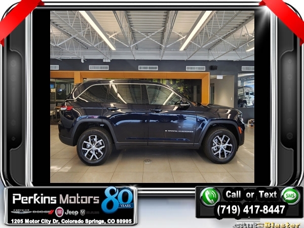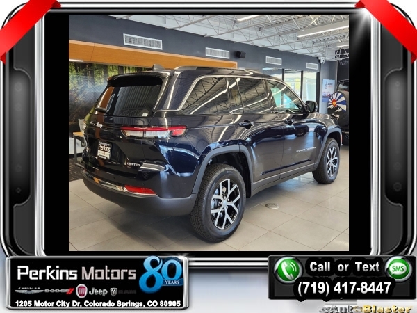 Factory MSRP: $47,295 $2,500 off MSRP! Midnight Sky 2025 Jeep Grand Cherokee Limited 4WD 8-Speed Automatic 3.6L V6 24V VVT<br>4WD.<br>Check us out at www.perkinsmotors.com to see our specials! Since opening our doors in 1944, we’ve been proud to serve Colorado Springs, CO, and the surrounding areas of Pueblo, Castle Rock and Denver, CO. Throughout this time of being family owned for 80 years, we’ve maintained a firm commitment to our customers: to offer a wide selection of New Chrysler, Dodge, Fiat, Jeep, and Ram vehicles and quality pre-owned vehicles, and provide a quick, no-hassle car-buying process that ensures everyone drives off the lot satisfied with their purchase.<br><br>Quick Order Package 22E, 4WD, 4-Wheel Disc Brakes, 6 Speakers, ABS brakes, Active Noise Control System, Air Conditioning, Alloy wheels, AM/FM radio: SiriusXM with 360L, Anti-whiplash front head restraints, Audio memory, Auto High-beam Headlights, Automatic temperature control, Brake assist, Bumpers: body-color, Capri Leatherette Seats, Compass, Cruise Control, Delay-off headlights, Driver door bin, Driver vanity mirror, Dual front impact airbags, Dual front side impact airbags, Electronic Stability Control, Emergency communication system, Four wheel independent suspension, Front anti-roll bar, Front Bucket Seats, Front Center Armrest w/Storage, Front dual zone A/C, Front fog lights, Front License Plate Bracket, Front reading lights, Fully automatic headlights, Garage door transmitter, Heated door mirrors, Heated front seats, Heated rear seats, Heated steering wheel, Illuminated entry, Knee airbag, Low tire pressure warning, Memory seat, Model Year Tracking, Navigation System, Normal Duty Suspension, Occupant sensing airbag, Outside temperature display, Overhead airbag, Overhead console, Panic alarm, ParkView Rear Back-Up Camera, Passenger door bin, Passenger vanity mirror, Power door mirrors, Power driver seat, Power Liftgate, Power passenger seat, Power steering, Power windows, Radio data system, Radio: Uconnect 5 Nav w/10.1 Display, Rear anti-roll bar, Rear reading lights, Rear window defroster, Rear window wiper, Remote keyless entry, Roof rack: rails only, Security system, Speed-Sensitive Wipers, Split folding rear seat, Spoiler, Steering wheel mounted audio controls, Tachometer, Telescoping steering wheel, Tilt steering wheel, Traction control, Trip computer, Turn signal indicator mirrors, Variably intermittent wipers, Voltmeter, and Wheels: 18 x 8 Polished/Painted Aluminum.<br><br>19/26 City/Highway MPG Sale price includes all manufacture's incentives and dealer discounts. Sale price not available on lease or compatible with special APR. $1000 - 2025 National Retail Consumer Cash. Exp. 10/31/2024
