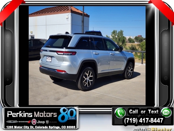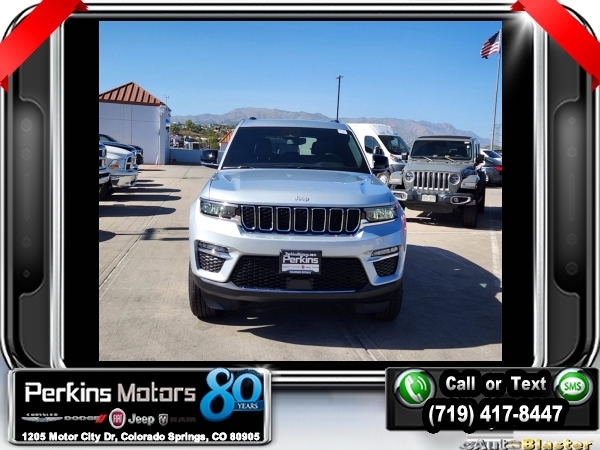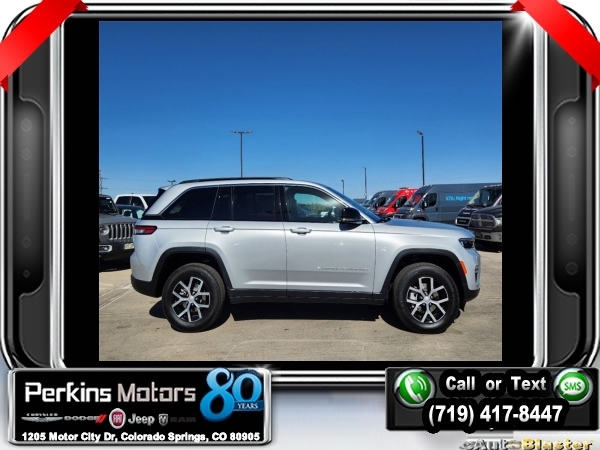 Factory MSRP: $47,295 $5,500 off MSRP! Silver Zynith 2025 Jeep Grand Cherokee Limited 4WD 8-Speed Automatic 3.6L V6 24V VVT<br>4WD.<br>Check us out at www.perkinsmotors.com to see our specials! Since opening our doors in 1944, we’ve been proud to serve Colorado Springs, CO, and the surrounding areas of Pueblo, Castle Rock and Denver, CO. Throughout this time of being family owned for 80 years, we’ve maintained a firm commitment to our customers: to offer a wide selection of New Chrysler, Dodge, Fiat, Jeep, and Ram vehicles and quality pre-owned vehicles, and provide a quick, no-hassle car-buying process that ensures everyone drives off the lot satisfied with their purchase.<br><br>Quick Order Package 22E, 4WD, 4-Wheel Disc Brakes, 6 Speakers, ABS brakes, Active Noise Control System, Air Conditioning, Alloy wheels, AM/FM radio: SiriusXM with 360L, Anti-whiplash front head restraints, Audio memory, Auto High-beam Headlights, Automatic temperature control, Brake assist, Bumpers: body-color, Capri Leatherette Seats, Compass, Cruise Control, Delay-off headlights, Driver door bin, Driver vanity mirror, Dual front impact airbags, Dual front side impact airbags, Electronic Stability Control, Emergency communication system, Four wheel independent suspension, Front anti-roll bar, Front Bucket Seats, Front Center Armrest w/Storage, Front dual zone A/C, Front fog lights, Front License Plate Bracket, Front reading lights, Fully automatic headlights, Garage door transmitter, Heated door mirrors, Heated front seats, Heated rear seats, Heated steering wheel, Illuminated entry, Knee airbag, Low tire pressure warning, Memory seat, Model Year Tracking, Navigation System, Normal Duty Suspension, Occupant sensing airbag, Outside temperature display, Overhead airbag, Overhead console, Panic alarm, ParkView Rear Back-Up Camera, Passenger door bin, Passenger vanity mirror, Power door mirrors, Power driver seat, Power Liftgate, Power passenger seat, Power steering, Power windows, Radio data system, Radio: Uconnect 5 Nav w/10.1 Display, Rear anti-roll bar, Rear reading lights, Rear window defroster, Rear window wiper, Remote keyless entry, Security system, Speed-Sensitive Wipers, Split folding rear seat, Spoiler, Steering wheel mounted audio controls, Tachometer, Telescoping steering wheel, Tilt steering wheel, Traction control, Trip computer, Turn signal indicator mirrors, Variably intermittent wipers, Voltmeter, and Wheels: 18 x 8 Polished/Painted Aluminum.<br><br>19/26 City/Highway MPG Sale price includes all manufacture's incentives and dealer discounts. Sale price not available on lease or compatible with special APR. $1000 - 2025 National Retail Consumer Cash. Exp. 01/02/2025 $1500 - 2025 National Holiday Bonus Cash. Exp. 01/02/2025
