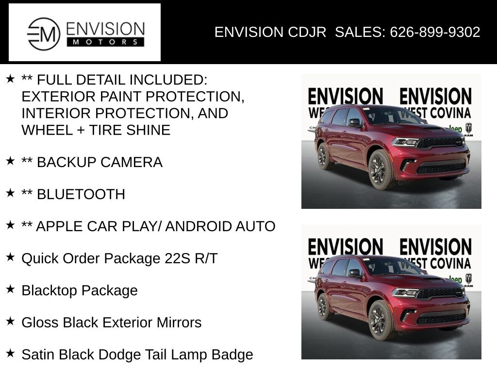 ** FULL DETAIL INCLUDED: EXTERIOR PAINT PROTECTION, INTERIOR PROTECTION, AND WHEEL + TIRE SHINE, ** BACKUP CAMERA, ** BLUETOOTH, ** APPLE CAR PLAY/ ANDROID AUTO, AWD, Black Roof Rails, Blacktop Package, Gloss Black Badges, Gloss Black Exterior Mirrors, Integrated Roof Rail Crossbars, Quick Order Package 22S R/T, Satin Black Dodge Tail Lamp Badge, Wheels: 20" x 8.0" Black Noise Aluminum.Octane Red Pearlcoat2025 Dodge Durango R/T Blacktop AWD 8-Speed Automatic HEMI 5.7L V8 Multi Displacement VVT Price includes: $2250 - 2025 National Retail Bonus Cash . Exp. 09/02/2025 $500 - 2025 National 2025 Military Bonus Cash. Exp. 01/05/2026