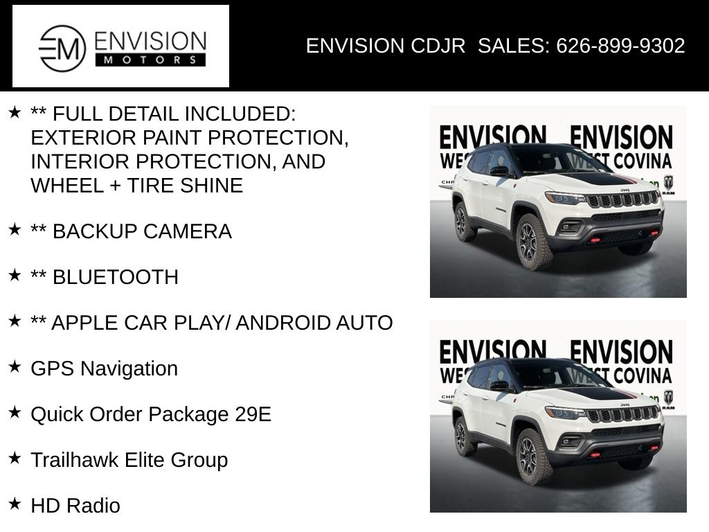 24/32 City/Highway MPG ** FULL DETAIL INCLUDED: EXTERIOR PAINT PROTECTION, INTERIOR PROTECTION, AND WHEEL + TIRE SHINE, ** BACKUP CAMERA, ** BLUETOOTH, ** APPLE CAR PLAY/ ANDROID AUTO, 4WD, 10.1" Touchscreen Display, 2nd Row USB Type A/C Charge Only, Alexa Built-In, Cluster 10.25" TFT Color Display, Connected Travel & Traffic Services, Driver Seat Memory, Foot Activated Open 'N Go Liftgate, GPS Navigation, HD Radio, Heated Front Seats, Heated Steering Wheel, Integrated Voice Command w/Bluetooth, LED Low/Highbeam Projector Headlamps, Power 2-Way Driver Lumbar Adjust, Power 2-Way Passenger Lumbar Adjust, Power 8-Way Adjust Front Passenger Seat, Power Adjust 8-Way Driver Seat, Power Liftgate, Premium Leather Trimmed Bucket Seats, Premium LED Fog Lamps, Premium Taillamps, Quick Order Package 29E, Remote Start System, Reversible Carpet/Vinyl Cargo Mat, SiriusXM w/360L, Trailhawk Elite Group, Ventilated Front Seats, Windshield Wiper De-Icer.Bright White Clearcoat2025 Jeep Compass Trailhawk 4WD 8-Speed Automatic 2.0L I4 DOHC Price includes: $1500 - 2025 National SFS Lease Loyalty Bonus Cash. Exp. 06/02/2025 $1641 - 2025 National Minimum Employee Pricing Discount. Exp. 06/02/2025