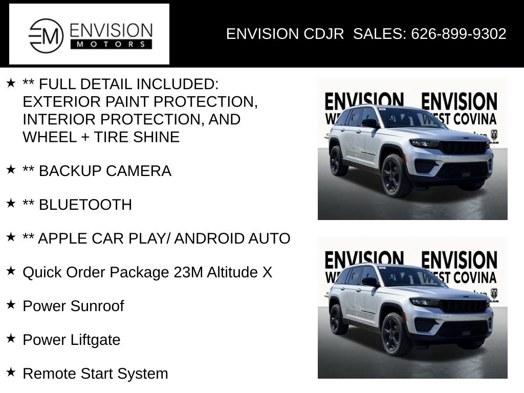 19/26 City/Highway MPG ** FULL DETAIL INCLUDED: EXTERIOR PAINT PROTECTION, INTERIOR PROTECTION, AND WHEEL + TIRE SHINE, ** BACKUP CAMERA, ** BLUETOOTH, ** APPLE CAR PLAY/ ANDROID AUTO, 4WD, 115V Auxiliary Power Outlet, Altitude X, Black Headliner, Capri Leatherette/Suede Seats, Delete Laredo Badge, Gloss Black Exterior Accents, Heated Front Seats, Heated Steering Wheel, Power Liftgate, Power Sunroof, Quick Order Package 23M Altitude X, Rain Sensitive Windshield Wipers, Remote Start System, Selectable Tire Fill Alert, Wheels: 18" x 8" Fully Painted Aluminum 1, Wireless Charging Pad.Silver Zynith2025 Jeep Grand Cherokee Altitude X 4WD 8-Speed Automatic 3.6L V6 24V VVT Price includes: $1000 - 2025 West BC SFS Bonus Cash . Exp. 06/02/2025 $1000 - 2025 West BC SFS Bonus Cash . Exp. 06/02/2025 $2000 - 2025 National SFS Lease Loyalty Bonus Cash. Exp. 06/02/2025 $3020 - 2025 National Minimum Employee Pricing Discount. Exp. 06/02/2025