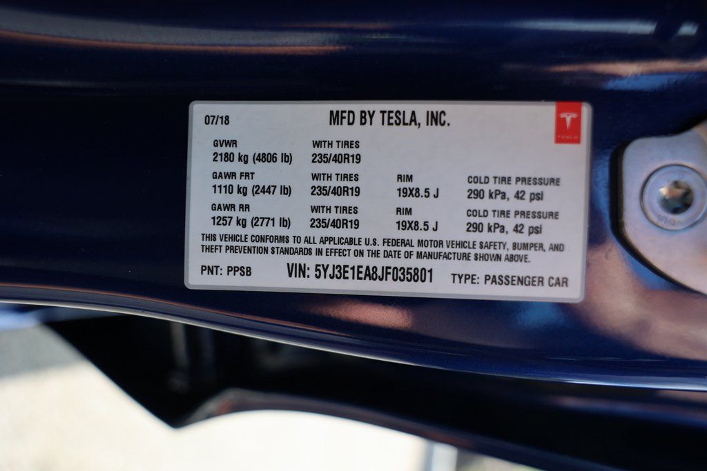 Deep Blue Metallic 2018 Tesla Model 3 Long Range RWD 1-Speed Automatic Electric Motor 15 Speakers, Air Conditioning, Brake assist, Electronic Stability Control, Exterior Parking Camera Rear, Front fog lights, Fully automatic headlights, Heated front seats, Heated rear seats, Lane Departure Warning System, Memory seat, Navigation System, Radio: FM w/Premium Audio System, Security system, Speed control, Synthetic Leather Seat Trim, Wheels: 18" Aero.136/123 City/Highway MPG