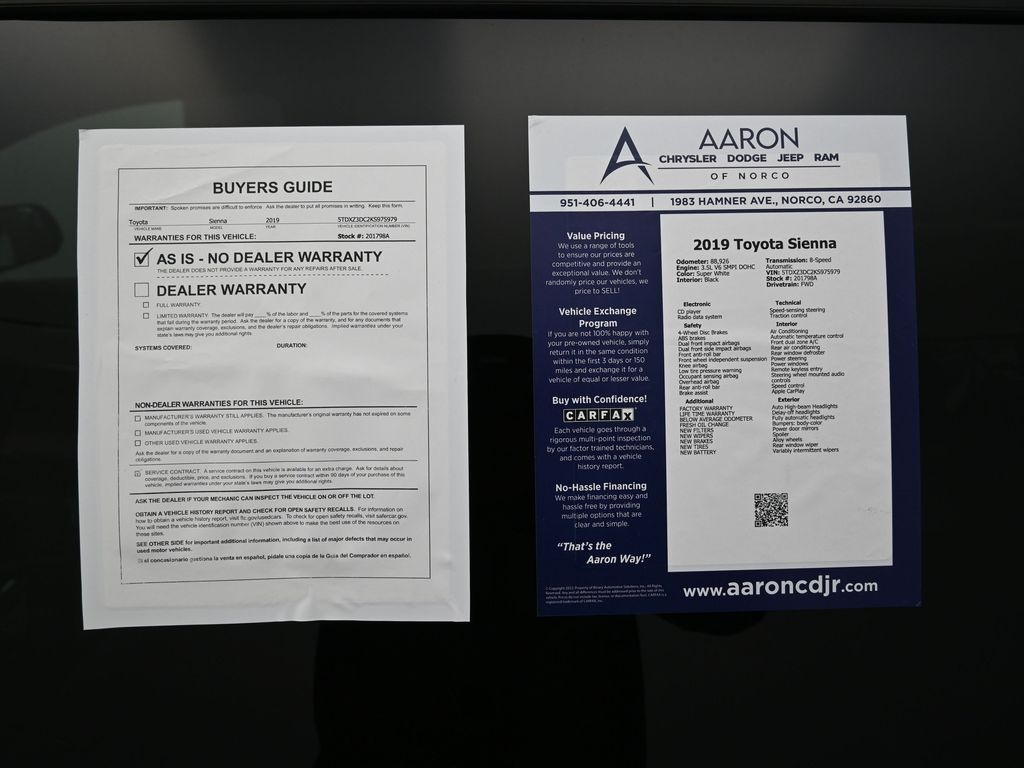 Priced below KBB Fair Purchase Price!Sienna SE, 4D Passenger Van, 3.5L V6 SMPI DOHC, 8-Speed Automatic, FWD, ABS brakes, Active Cruise Control, Alloy wheels, Bumpers: body-color, Compass, Electronic Stability Control, Front dual zone A/C, Heated door mirrors, Heated front seats, Illuminated entry, Leather Seat Material, Low tire pressure warning, Power door mirrors, Power Liftgate, Remote keyless entry, Roof rack: rails only, Spoiler, Traction control.For help with any Vehicle needs please call us directly at 951-621-1288.Clean CARFAX.Awards: * 2019 KBB.com 12 Best Family Cars * 2019 KBB.com Best Resale Value Awards * 2019 KBB.com Brand Image Awards