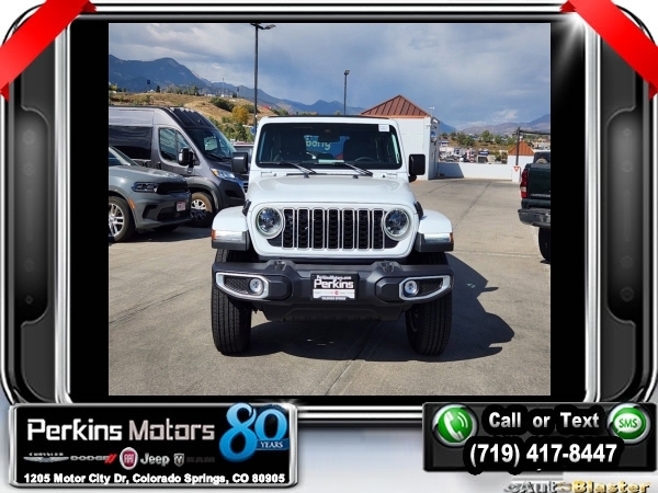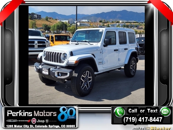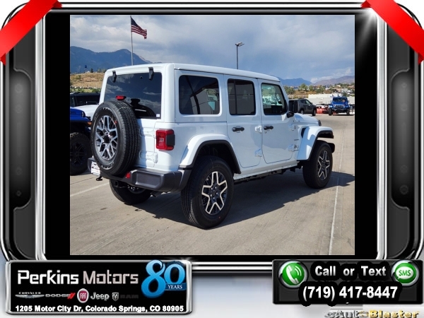 Factory MSRP: $58,640 $7,000 off MSRP! Bright White Clearcoat 2024 Jeep Wrangler Sahara 4WD 8-Speed Automatic 2.0L I4 DOHC<br><br>Check us out at www.perkinsmotors.com to see our specials! Since opening our doors in 1944, we’ve been proud to serve Colorado Springs, CO, and the surrounding areas of Pueblo, Castle Rock and Denver, CO. Throughout this time of being family owned for 80 years, we’ve maintained a firm commitment to our customers: to offer a wide selection of New Chrysler, Dodge, Fiat, Jeep, and Ram vehicles and quality pre-owned vehicles, and provide a quick, no-hassle car-buying process that ensures everyone drives off the lot satisfied with their purchase.<br><br>Quick Order Package 22G Sahara, Trailer Tow & Aux Switch Group (7 & 4 Pin Wiring Harness, Auxiliary Switches, and Class II Receiver Hitch), 110 MPH Vehicle Max Speed Calibration, 12.3 Touchscreen Display, 3.45 Overall Top Gear Ratio, 4-Wheel Disc Brakes, 8 Speakers, ABS brakes, Air Conditioning, Alloy wheels, AM/FM radio: SiriusXM, Apple CarPlay, Apple CarPlay/Android Auto, Automatic temperature control, Aux Battery, Brake assist, Cloth Low-Back Bucket Seats, Compass, Connectivity - US/Canada, Cruise Control, Delay-off headlights, Disassociated Touchscreen Display, Driver door bin, Driver vanity mirror, Dual front impact airbags, Dual front side impact airbags, Electronic Stability Control, Emergency communication system: Jeep Connect, Front anti-roll bar, Front Bucket Seats, Front Center Armrest w/Storage, Front dual zone A/C, Front fog lights, Front License Plate Bracket, Front reading lights, Fully automatic headlights, Google Android Auto, Heated door mirrors, Heated front seats, Heated steering wheel, Heavy Duty Suspension w/Gas Shocks, Illuminated entry, Integrated Center Stack Radio, Integrated roll-over protection, Integrated Voice Command w/Bluetooth, Jeep Trail Rated Kit, Low tire pressure warning, MOPAR All-Weather Floor Mats, Non-Lock Fuel Cap w/o Discriminator, Occupant sensing airbag, Outside temperature display, Overhead airbag, Panic alarm, ParkView Rear Back-Up Camera, Passenger door bin, Passenger vanity mirror, Power door mirrors, Power steering, Power Top Quarter Window Storage Bag, Power windows, Radio data system, Radio: Uconnect 5 w/12.3 Display, Rear anti-roll bar, Rear reading lights, Rear Window Defroster, Rear Window Wiper/Washer, Remote keyless entry, Removable Rear Quarter Windows, Security system, Sky 1-Touch Power Top, Split folding rear seat, Steering wheel mounted audio controls, Stop-Start Dual Battery System, Tachometer, Telescoping steering wheel, Tilt steering wheel, Traction control, Trip computer, Variably intermittent wipers, Voltmeter, and Wheels: 18 x 7.5 Machine/Painted Gray. Sale price includes all manufacture's incentives and dealer discounts. Sale price not available on lease or compatible with special APR. $3000 - 2024 Bonus Cash . Exp. 12/02/2024