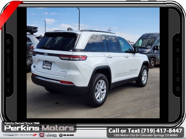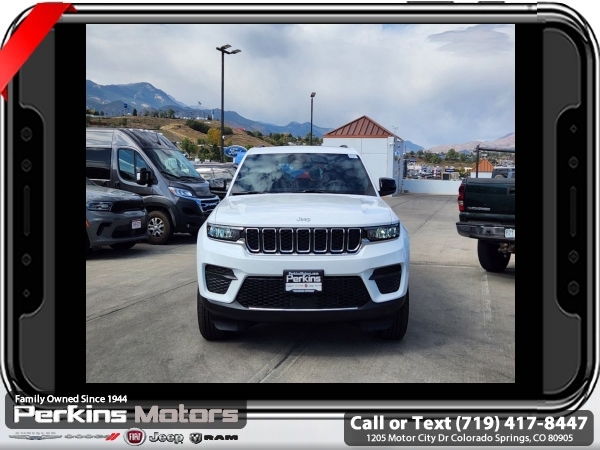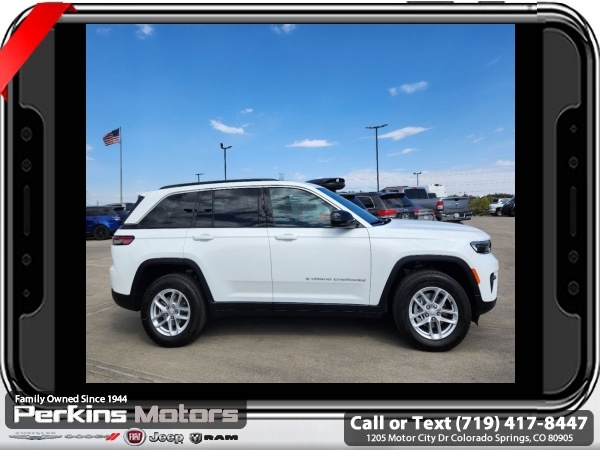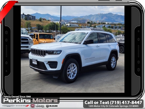 Factory MSRP: $41,580 $6,000 off MSRP! Priced below KBB Fair Purchase Price! Bright White Clearcoat 2025 Jeep Grand Cherokee Laredo 4WD 8-Speed Automatic 3.6L V6 24V VVT<br>4WD.<br>Check us out at www.perkinsmotors.com to see our specials! Since opening our doors in 1944, we’ve been proud to serve Colorado Springs, CO, and the surrounding areas of Pueblo, Castle Rock and Denver, CO. Throughout this time of being family owned for 80 years, we’ve maintained a firm commitment to our customers: to offer a wide selection of New Chrysler, Dodge, Fiat, Jeep, and Ram vehicles and quality pre-owned vehicles, and provide a quick, no-hassle car-buying process that ensures everyone drives off the lot satisfied with their purchase.<br><br>Quick Order Package 23D Laredo X (Laredo X and Wheels: 18 x 8 Fully Painted Aluminum), 4WD, 4-Wheel Disc Brakes, 6 Speakers, ABS brakes, Air Conditioning, Alloy wheels, Anti-whiplash front head restraints, Automatic temperature control, Brake assist, Bumpers: body-color, Cloth Seats, Compass, Cruise Control, Delay-off headlights, Driver door bin, Driver vanity mirror, Dual front impact airbags, Dual front side impact airbags, Electronic Stability Control, Emergency communication system, Four wheel independent suspension, Front anti-roll bar, Front Bucket Seats, Front Center Armrest w/Storage, Front dual zone A/C, Front License Plate Bracket, Front reading lights, Fully automatic headlights, Heated door mirrors, Illuminated entry, Knee airbag, Low tire pressure warning, Model Year Tracking, Normal Duty Suspension, Occupant sensing airbag, Outside temperature display, Overhead airbag, Overhead console, Panic alarm, ParkView Rear Back-Up Camera, Passenger door bin, Passenger vanity mirror, Power door mirrors, Power driver seat, Power steering, Power windows, Radio data system, Radio: Uconnect 5 w/8.4 Display, Rear anti-roll bar, Rear reading lights, Rear window defroster, Rear window wiper, Remote keyless entry, Security system, Speed-Sensitive Wipers, Split folding rear seat, Spoiler, Steering wheel mounted audio controls, Tachometer, Telescoping steering wheel, Tilt steering wheel, Traction control, Trip computer, Variably intermittent wipers, Voltmeter, and Wheels: 17 x 6.5 Fully Painted Aluminum.<br><br>19/26 City/Highway MPG Sale price includes all manufacture's incentives and dealer discounts. Sale price not available on lease or compatible with special APR. $1000 - 2025 National Retail Consumer Cash. Exp. 04/30/2025 $1000 - 2025 West BC SFS Bonus Cash . Exp. 04/30/2025 $1500 - 2025 National Jeep Celebration Event Retail Bonus Cash . Exp. 04/30/2025