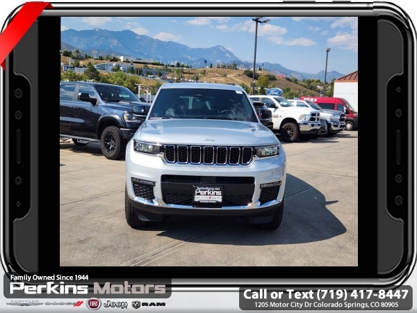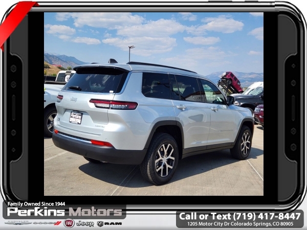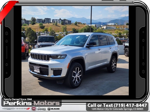 Factory MSRP: $49,295 $6,018 off MSRP! Priced below KBB Fair Purchase Price! Silver Zynith 2025 Jeep Grand Cherokee L Limited 4WD 8-Speed Automatic 3.6L V6 24V VVT<br><br>Check us out at www.perkinsmotors.com to see our specials! Since opening our doors in 1944, we’ve been proud to serve Colorado Springs, CO, and the surrounding areas of Pueblo, Castle Rock and Denver, CO. Throughout this time of being family owned for 80 years, we’ve maintained a firm commitment to our customers: to offer a wide selection of New Chrysler, Dodge, Fiat, Jeep, and Ram vehicles and quality pre-owned vehicles, and provide a quick, no-hassle car-buying process that ensures everyone drives off the lot satisfied with their purchase.<br><br>Quick Order Package 22E, 3.45 Rear Axle Ratio, 3rd row seats: split-bench, 4-Wheel Disc Brakes, 6 Speakers, ABS brakes, Active Noise Control System, Air Conditioning, Alloy wheels, AM/FM radio: SiriusXM with 360L, Anti-whiplash front head restraints, Audio memory, Auto High-beam Headlights, Automatic temperature control, Brake assist, Bumpers: body-color, Capri Leatherette Seats, Compass, Cruise Control, Delay-off headlights, Driver door bin, Driver vanity mirror, Dual front impact airbags, Dual front side impact airbags, Electronic Stability Control, Emergency communication system, Four wheel independent suspension, Front anti-roll bar, Front Bucket Seats, Front Center Armrest w/Storage, Front dual zone A/C, Front fog lights, Front License Plate Bracket, Front reading lights, Fully automatic headlights, Garage door transmitter, Heated door mirrors, Heated front seats, Heated rear seats, Heated steering wheel, Illuminated entry, Knee airbag, Low tire pressure warning, Manual Fold Seatbacks, Memory seat, Model Year Tracking, Navigation System, Normal Duty Suspension, Occupant sensing airbag, Outside temperature display, Overhead airbag, Overhead console, Panic alarm, ParkView Rear Back-Up Camera, Passenger door bin, Passenger vanity mirror, Power door mirrors, Power driver seat, Power Liftgate, Power passenger seat, Power steering, Power windows, Radio data system, Radio: Uconnect 5 Nav w/10.1 Display, Rear air conditioning, Rear anti-roll bar, Rear reading lights, Rear window defroster, Rear window wiper, Reclining 3rd row seat, Remote keyless entry, Security system, Speed-Sensitive Wipers, Split folding rear seat, Spoiler, Steering wheel mounted audio controls, Tachometer, Telescoping steering wheel, Tilt steering wheel, Traction control, Trip computer, Turn signal indicator mirrors, Variably intermittent wipers, Voltmeter, and Wheels: 18 x 8.0 Polished/Painted Aluminum.