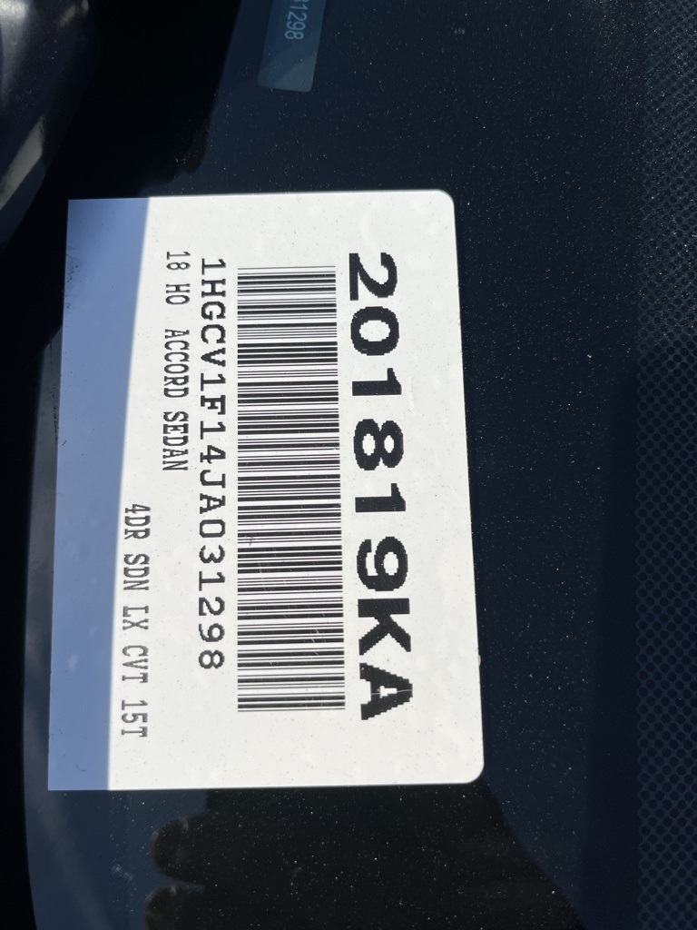 LIFE TIME WARRANTY, FRESH OIL CHANGE, NEW FILTERS, NEW WIPERS, Accord LX, 4D Sedan, 1.5T I4 DOHC 16V Turbocharged VTEC, FWD, Black Cloth, Alloy wheels, Exterior Parking Camera Rear, Front dual zone A/C, Knee airbag, Low tire pressure warning.For help with any Vehicle needs please call us directly at 951-621-1288.Clean CARFAX.Awards: * JD Power Automotive Performance, Execution and Layout (APEAL) Study * ALG Residual Value Awards, Residual Value Awards * NACTOY 2018 North American Car of the Year * 2018 KBB.com Brand Image Awards * 2018 KBB.com 10 Most Awarded BrandsKelley Blue Book Brand Image Awards are based on the Brand Watch(tm) study from Kelley Blue Book Market Intelligence. Award calculated among non-luxury shoppers. For more information, visit www.kbb.com. Kelley Blue Book is a registered trademark of Kelley Blue Book Co., Inc.