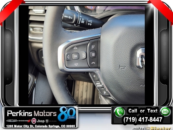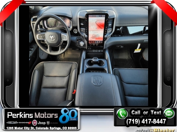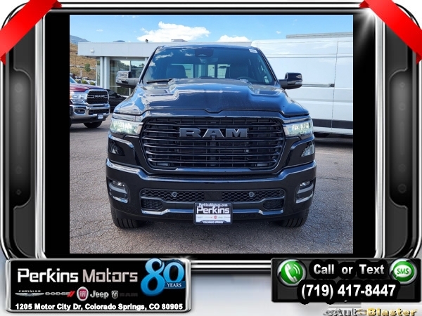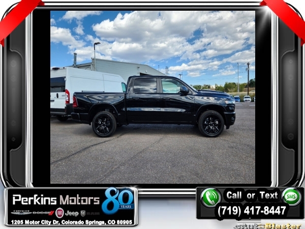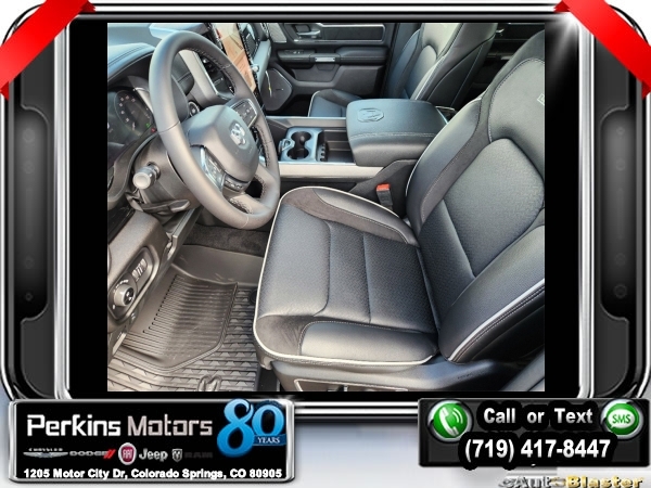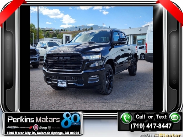 Factory MSRP: $72,915 $11,500 off MSRP! Diamond Black Crystal Pearlcoat 2025 Ram 1500 Laramie 4WD 8-Speed Automatic 3.0L I6<br><br>Check us out at www.perkinsmotors.com to see our specials! Since opening our doors in 1944, we’ve been proud to serve Colorado Springs, CO, and the surrounding areas of Pueblo, Castle Rock and Denver, CO. Throughout this time of being family owned for 80 years, we’ve maintained a firm commitment to our customers: to offer a wide selection of New Chrysler, Dodge, Fiat, Jeep, and Ram vehicles and quality pre-owned vehicles, and provide a quick, no-hassle car-buying process that ensures everyone drives off the lot satisfied with their purchase.<br><br>Laramie Level 2 Equipment Group (14.4 Touchscreen Display, 4G LTE Wi-Fi Hot Spot, Apple CarPlay, Cluster 12 TFT Color Display, Connected Travel & Traffic Services, Connectivity - US/Canada, Disassociated Touchscreen Display, For More Info, Call 800-643-2112, Global Telematics Box Module (TBM), Google Android Auto, GPS Antenna Input, GPS Navigation, harman/kardon 19 Speaker Premium Sound, HD Radio, Integrated Center Stack Radio, Integrated Voice Command w/Bluetooth, Power Tailgate, Radio: Uconnect 5 Nav w/14.4 Display, Rain Sensitive Windshield Wipers, SiriusXM Radio Service, SiriusXM w/360L, and USB Host Flip), Night Edition (#1 Seat Foam Cushion, 3 Rear Seat Head Restraints, 4 Way Front Headrests, Accent Color Door Handles, Accent Color Premium Power Mirrors, Accent Color Tailgate Handle, Auto Power-Folding Mirrors, Auto-Dimming Exterior Driver Mirror, Black Exterior Truck Badging, Black Headlamp Bezels, Black Interior Accents, Black Painted Exterior Mirrors Caps, Black Tail Lamp Bezels, Body Color Front Bumper, Body Color Rear Bumper w/Step Pads, Bucket Seats, Center Console Parts Module, Convex Wide-Angle Exterior Mirror Insert, Driver Seat Memory, Dual Exhaust w/Black Tips, Exterior Front Lighting Animation, Exterior Mirrors Approach Lamps, Exterior Mirrors Courtesy Lamps, Exterior Mirrors w/Heating Element, Exterior Mirrors w/Memory, Exterior Mirrors w/Supplemental Signals, Exterior Rear Lighting Animation, Front Seat Back Map Pockets, Full Length Upgraded Floor Console, Grille Surround 3 Black Texture 2 Black, Heated Front Seats, Heated Second Row Seats, Heated Steering Wheel, Leather Trimmed Bucket Seats, Pirelli Brand Tires, Power 2-Way Driver Lumbar Adjust, Power 2-Way Passenger Lumbar Adjust, Power Adjust 8-Way Driver Seat, Power Adjust 8-Way Front Passenger Seat, Proximity Approach/Departure Lamps, RAM Grille Badge - Black, Rear 60/40 Folding Split Recline Seat, Sport Performance Hood, Ventilated Front Seats, and Wheels: 22 x 9 Forged Aluminum), Quick Order Package 21H Laramie, 10 Speakers, 3.55 Rear Axle Ratio, 4-Wheel Disc Brakes, ABS brakes, Air Conditioning, Alloy wheels, AM/FM radio: SiriusXM with 360L, Anti-Spin Differential Rear Axle, Apple CarPlay/Android Auto, Audio memory, Auto High-beam Headlights, Auto-dimming door mirrors, Auto-dimming Rear-View mirror, Automatic temperature control, Brake assist, Bumpers: chrome, Chrome Exterior Mirrors, Compass, Cruise Control, Delay-off headlights, Driver door bin, Driver vanity mirror, Dual front impact airbags, Dual front side impact airbags, Electronic Stability Control, Engine Block Heater, Front anti-roll bar, Front Center Armrest w/Storage, Front dual zone A/C, Front fog lights, Front License Plate Bracket, Front reading lights, Front wheel independent suspension, Fully automatic headlights, Garage door transmitter, Heated door mirrors, Heated front seats, Heated rear seats, Heated steering wheel, Illuminated entry, Leather steering wheel, Leather Trim 40/20/40 Bench Seat, Low tire pressure warning, Memory seat, MOPAR Front & Rear Rubber Floor Mats, Navigation System, Occupant sensing airbag Sale price includes all manufacture's incentives and dealer discounts. Sale price not available on lease or compatible with special APR. $4000 - 2025 National Retail Consumer Cash. Exp. 1