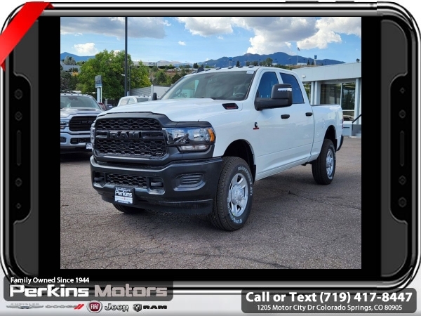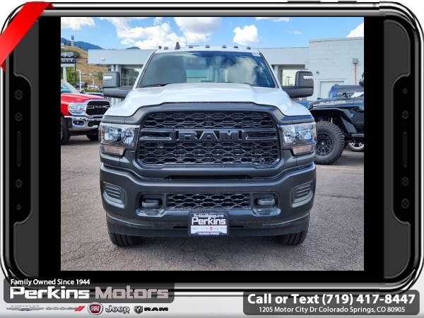 Factory MSRP: $67,395 $14,560 off MSRP! Priced below KBB Fair Purchase Price! Bright White Clearcoat 2024 Ram 3500 Tradesman 4WD 6-Speed Automatic Cummins 6.7L I6 Turbodiesel<br><br>Check us out at www.perkinsmotors.com to see our specials! Since opening our doors in 1944, we’ve been proud to serve Colorado Springs, CO, and the surrounding areas of Pueblo, Castle Rock and Denver, CO. Throughout this time of being family owned for 80 years, we’ve maintained a firm commitment to our customers: to offer a wide selection of New Chrysler, Dodge, Fiat, Jeep, and Ram vehicles and quality pre-owned vehicles, and provide a quick, no-hassle car-buying process that ensures everyone drives off the lot satisfied with their purchase.<br><br>Cold Weather Group (Engine Block Heater and MOPAR Winter Front Grille Cover), Protection Group, Quick Order Package 2HA Tradesman, Snow Chief Group (Auxiliary Switches Prep, Clearance Lamps, Dash Pass Thru Wire Circuits, and I/P Mounted Auxiliary Switches), Tradesman Level 1 Equipment Group, 2 Way Rear Headrest Seat, 220 Amp Alternator, 3.73 Axle Ratio, 4 Way Front Headrests, 4-Wheel Disc Brakes, 40/20/40 Split Bench Seat, 4G LTE Wi-Fi Hot Spot, 6 Speakers, 8.4 Touchscreen Display, ABS brakes, Active Noise Control System, Air Conditioning, All R1 Low Radios, All Radio Equipped Vehicles, AM/FM radio, Apple CarPlay, Auto Power-Folding Mirrors, Black Exterior Mirrors, Bluetooth Handsfree Phone & Audio, Brake assist, Center Hub, Compass, Connectivity - US/Canada, Cruise Control, Delay-off headlights, Driver door bin, Dual Alternators Rated At 440 Amps, Dual front impact airbags, Dual front side impact airbags, Electric Shift-On-The-Fly Transfer Case, Electronic Stability Control, Electronically Controlled Throttle, Emergency communication system: SiriusXM Guardian, Exterior Mirrors Courtesy Lamps, Exterior Mirrors w/Heating Element, Exterior Mirrors w/Supplemental Signals, For Details Visit DriveUconnect.com, For More Info, Call 800-643-2112, Forward & Reverse Utility Lights, Front anti-roll bar, Front Armrest w/Cupholders, Front Center Armrest w/Storage, Front License Plate Bracket, Front reading lights, Fully automatic headlights, Global Telematics Box Module (TBM), Google Android Auto, GPS Antenna Input, HD Vinyl 40/20/40 Split Bench Seat, Illuminated entry, Integrated Center Stack Radio, Integrated Voice Command w/Bluetooth, Low tire pressure warning, Manual Adjust 4-Way Driver Seat, Manual Adjust 4-Way Front Passenger Seat, Manual Folding Exterior Mirrors, Manual Telescoping Mirrors, Manufacturer's Statement of Origin, Mirror Running Lights, MOPAR Front & Rear Rubber Floor Mats, Occupant sensing airbag, Outside temperature display, Overhead airbag, Overhead console, Panic alarm, ParkView Rear Back-Up Camera, Passenger door bin, Passenger vanity mirror, Power Adjust Mirrors, Power Heated Fold Telescopic Mirrors, Power steering, Power Telescoping Mirrors, Power windows, Power-Adjustable Convex Aux Mirrors, Radio data system, Radio: Uconnect 3 w/5 Display, Radio: Uconnect 5 w/8.4 Display, Rear Folding Seat, Rear step bumper, Remote keyless entry, Remote USB Port - Charge Only, Selectable Tire Fill Alert, SiriusXM Radio Service, SiriusXM Satellite Radio, Storage Tray, Tachometer, Tilt steering wheel, Tip Start, Traction control, Trailer Brake Control, Trailer Light Check, Variably intermittent wipers, Voltmeter, and Wheels: 18 x 8.0 SteeL. Sale price includes all manufacture's incentives and dealer discounts. Sale price not available on lease or compatible with special APR. $1000 - 2024West BC Trade Assist Bonus Cash. Exp. 06/30/2025 $1500 - 2024 National Stellantis Loyalty Bonus Cash . Exp. 06/30/2025 $6371 - 2024 National Minimum Employee Pricing Discount . Exp. 06/30/2025