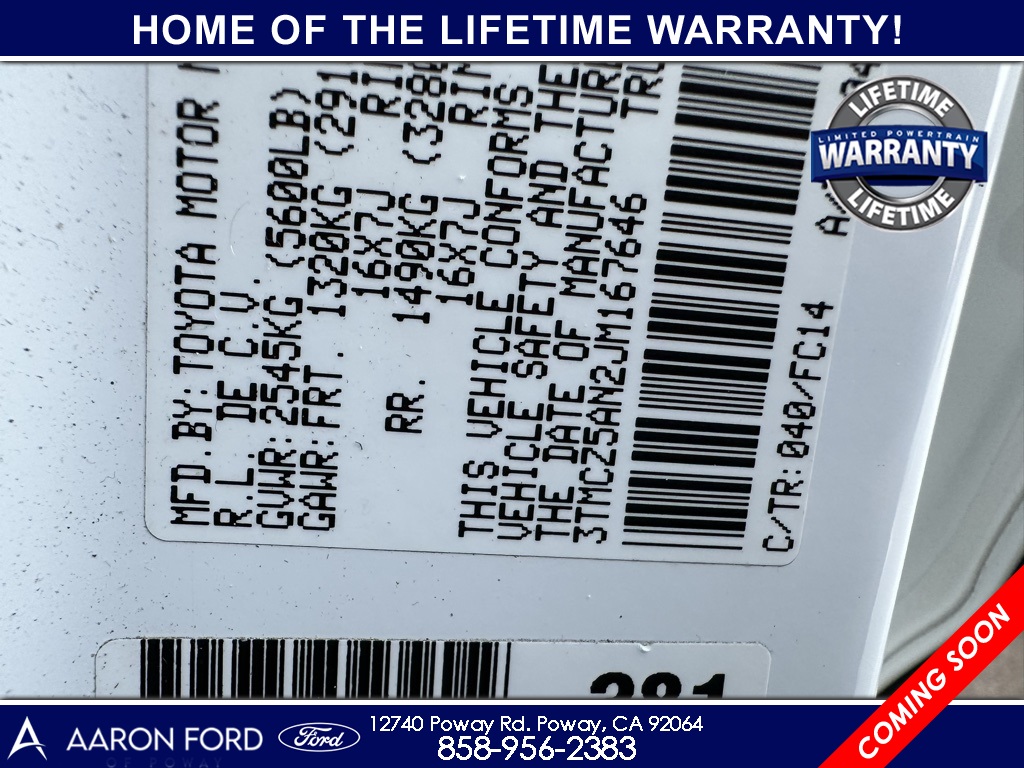 16" Silver Alloy Wheels, 6 Speakers, ABS brakes, Active Cruise Control, Air Conditioning, Alloy wheels, Axle Ratio: 3.91, Brake assist, Compass, Electronic Stability Control, Entune App Suite, Exterior Parking Camera Rear, Front Bucket Seats, Front Fog Lamps, Front fog lights, Illuminated entry, Low tire pressure warning, Power Sliding Rear Window w/Privacy Glass, Radio: Entune Premium w/AM/FM/CD/Nav/App Suite, Rear Parking Assist Sonar, Remote keyless entry, SR5 Parking Sonar & Navigation Package, Traction control.Clean CARFAX.To see more quality vehicles like this one right just click on AaronFordofPoway.com or dial (858) 748-1400.Awards: * 2018 KBB.com 5-Year Cost to Own Awards * 2018 KBB.com Best Resale Value Awards * 2018 KBB.com 10 Most Awarded Brands