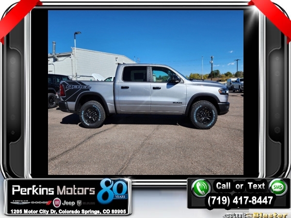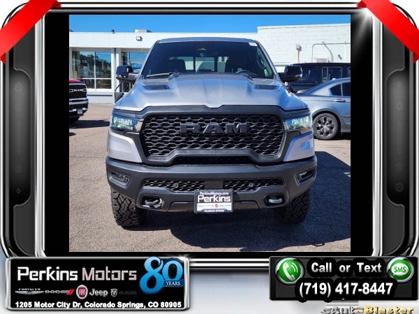 Factory MSRP: $73,160 $12,000 off MSRP! Priced below KBB Fair Purchase Price! Billet Silver Metallic Clearcoat 2025 Ram 1500 Rebel 4WD 8-Speed Automatic 3.0L I6<br><br>Check us out at www.perkinsmotors.com to see our specials! Since opening our doors in 1944, we’ve been proud to serve Colorado Springs, CO, and the surrounding areas of Pueblo, Castle Rock and Denver, CO. Throughout this time of being family owned for 80 years, we’ve maintained a firm commitment to our customers: to offer a wide selection of New Chrysler, Dodge, Fiat, Jeep, and Ram vehicles and quality pre-owned vehicles, and provide a quick, no-hassle car-buying process that ensures everyone drives off the lot satisfied with their purchase.<br><br>Quick Order Package 21W Rebel, Rebel Level 2 Equipment Group (115V Auxiliary Rear Power Outlet, 2-Door Passive Entry, Front Door Locks, 4G LTE Wi-Fi Hot Spot, Accent Color Door Handles, Accent Color Premium Power Mirrors, Accent Color Tailgate Handle, Apple CarPlay, Auto Power-Folding Mirrors, Auto-Dimming Exterior Driver Mirror, Black Painted Exterior Mirrors Caps, Connected Travel & Traffic Services, Connectivity - US/Canada, Convex Wide-Angle Exterior Mirror Insert, Driver Seat Memory, Dual Wireless Charging Pad, Exterior Mirrors Approach Lamps, Exterior Mirrors w/Heating Element, Exterior Mirrors w/Memory, Exterior Mirrors w/Supplemental Signals, Front Passenger Interactive Display, Google Android Auto, GPS Antenna Input, GPS Navigation, harman/kardon 19 Speaker Premium Sound, HD Radio, Heated Second Row Seats, Heated Steering Wheel, Integrated Voice Command w/Bluetooth, Media Hub w/2 Charge Only USBs, Power Adjust 8-Way Front Passenger Seat, Power Adjustable Pedals w/Memory, Power Tailgate, Proximity Approach/Departure Lamps, Radio: Uconnect 5 Nav w/14.4 Display, Radio/Driver Seat/Mirrors/Pedals Memory, Rain Sensitive Windshield Wipers, Rear Window Defroster, Security Alarm, SiriusXM w/360L, Smartphone As A Key Capable, and USB Host Flip), 10 Speakers, 3.92 Rear Axle Ratio, 33 Gallon Fuel Tank, 4 Way Front Headrests, 4-Wheel Disc Brakes, ABS brakes, Air Conditioning, Alloy wheels, AM/FM radio: SiriusXM with 360L, Apple CarPlay/Android Auto, Auto High-beam Headlights, Auto-dimming Rear-View mirror, Automatic temperature control, Brake assist, Bucket Seats, Cloth/Vinyl Bucket Seats, Compass, Cruise Control, Delay-off headlights, Dome Dual LED Reading Lamp, Driver door bin, Driver vanity mirror, Dual front impact airbags, Dual front side impact airbags, Dual-Pane Panoramic Sunroof, Electronic Stability Control, Front anti-roll bar, Front Bucket Seats, Front Center Armrest w/Storage, Front dual zone A/C, Front fog lights, Front License Plate Bracket, Front reading lights, Front Seat Back Map Pockets, Front wheel independent suspension, Full Length Upgraded Floor Console, Fully automatic headlights, Garage door transmitter, Heated door mirrors, Heated front seats, Heated steering wheel, Illuminated entry, Leather steering wheel, Low tire pressure warning, Manual Folding Exterior Mirrors, Navigation System, Occupant sensing airbag, Outside temperature display, Overhead airbag, Overhead console, Panic alarm, ParkView Rear Back-Up Camera, Passenger door bin, Passenger vanity mirror, Power Adjust 8-Way Driver Seat, Power door mirrors, Power driver seat, Power steering, Power windows, Radio data system, Radio: Uconnect 5 Nav w/12.0 Display, Rear 60/40 Folding Seat, Rear anti-roll bar, Rear seat center armrest, Rear step bumper, Remote keyless entry, Split folding rear seat, Steering wheel mounted audio controls, Tachometer, Telescoping steering wheel, Tilt steering wheel, Traction control, Trailer Brake Control, Trip computer, Variably intermittent wipers, Voltmeter, and Sale price includes all manufacture's incentives and dealer discounts. Sale price not available on lease or compatible with special APR. $1000 - 2025 National Holiday Bonus Cash. Exp. 01/02/2025 $4000 - 2025 National Retail Consumer Cash. Exp. 0