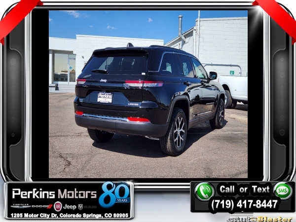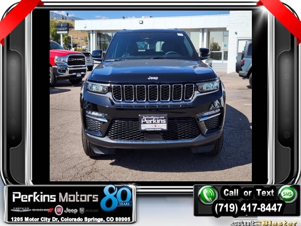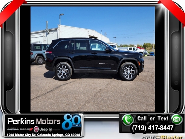 Factory MSRP: $47,295 $4,500 off MSRP! Diamond Black Crystal Pearlcoat 2025 Jeep Grand Cherokee Limited 4WD 8-Speed Automatic 3.6L V6 24V VVT<br>4WD.<br>Check us out at www.perkinsmotors.com to see our specials! Since opening our doors in 1944, we’ve been proud to serve Colorado Springs, CO, and the surrounding areas of Pueblo, Castle Rock and Denver, CO. Throughout this time of being family owned for 80 years, we’ve maintained a firm commitment to our customers: to offer a wide selection of New Chrysler, Dodge, Fiat, Jeep, and Ram vehicles and quality pre-owned vehicles, and provide a quick, no-hassle car-buying process that ensures everyone drives off the lot satisfied with their purchase.<br><br>Quick Order Package 22E, 4WD, 4-Wheel Disc Brakes, 6 Speakers, ABS brakes, Active Noise Control System, Air Conditioning, Alloy wheels, AM/FM radio: SiriusXM with 360L, Anti-whiplash front head restraints, Audio memory, Auto High-beam Headlights, Automatic temperature control, Brake assist, Bumpers: body-color, Capri Leatherette Seats, Compass, Cruise Control, Delay-off headlights, Driver door bin, Driver vanity mirror, Dual front impact airbags, Dual front side impact airbags, Electronic Stability Control, Emergency communication system, Four wheel independent suspension, Front anti-roll bar, Front Bucket Seats, Front Center Armrest w/Storage, Front dual zone A/C, Front fog lights, Front License Plate Bracket, Front reading lights, Fully automatic headlights, Garage door transmitter, Heated door mirrors, Heated front seats, Heated rear seats, Heated steering wheel, Illuminated entry, Knee airbag, Low tire pressure warning, Memory seat, Model Year Tracking, Navigation System, Normal Duty Suspension, Occupant sensing airbag, Outside temperature display, Overhead airbag, Overhead console, Panic alarm, ParkView Rear Back-Up Camera, Passenger door bin, Passenger vanity mirror, Power door mirrors, Power driver seat, Power Liftgate, Power passenger seat, Power steering, Power windows, Radio data system, Radio: Uconnect 5 Nav w/10.1 Display, Rear anti-roll bar, Rear reading lights, Rear window defroster, Rear window wiper, Remote keyless entry, Roof rack: rails only, Security system, Speed-Sensitive Wipers, Split folding rear seat, Spoiler, Steering wheel mounted audio controls, Tachometer, Telescoping steering wheel, Tilt steering wheel, Traction control, Trip computer, Turn signal indicator mirrors, Variably intermittent wipers, Voltmeter, and Wheels: 18 x 8 Polished/Painted Aluminum.<br><br>19/26 City/Highway MPG Sale price includes all manufacture's incentives and dealer discounts. Sale price not available on lease or compatible with special APR. $1000 - 2025 National Retail Consumer Cash. Exp. 12/02/2024