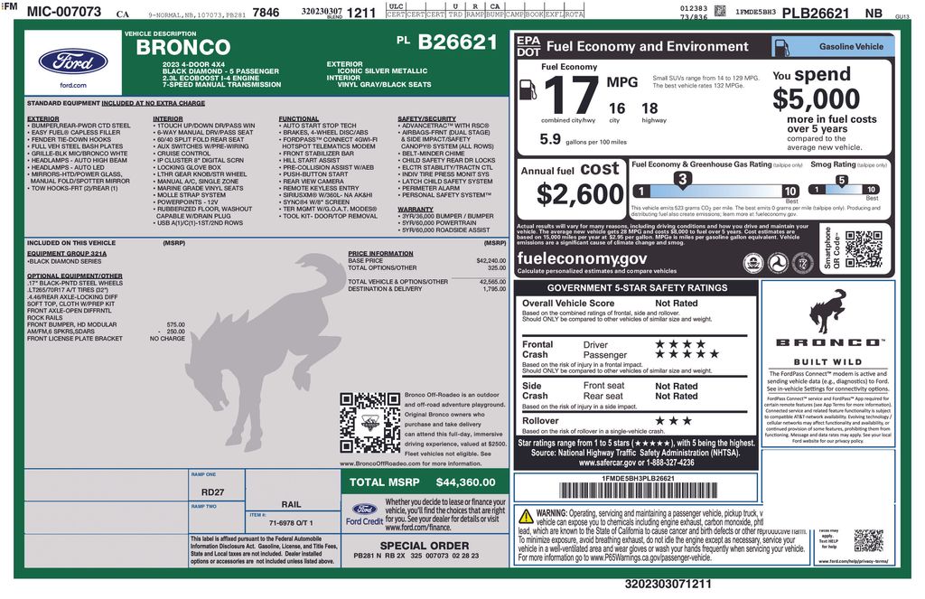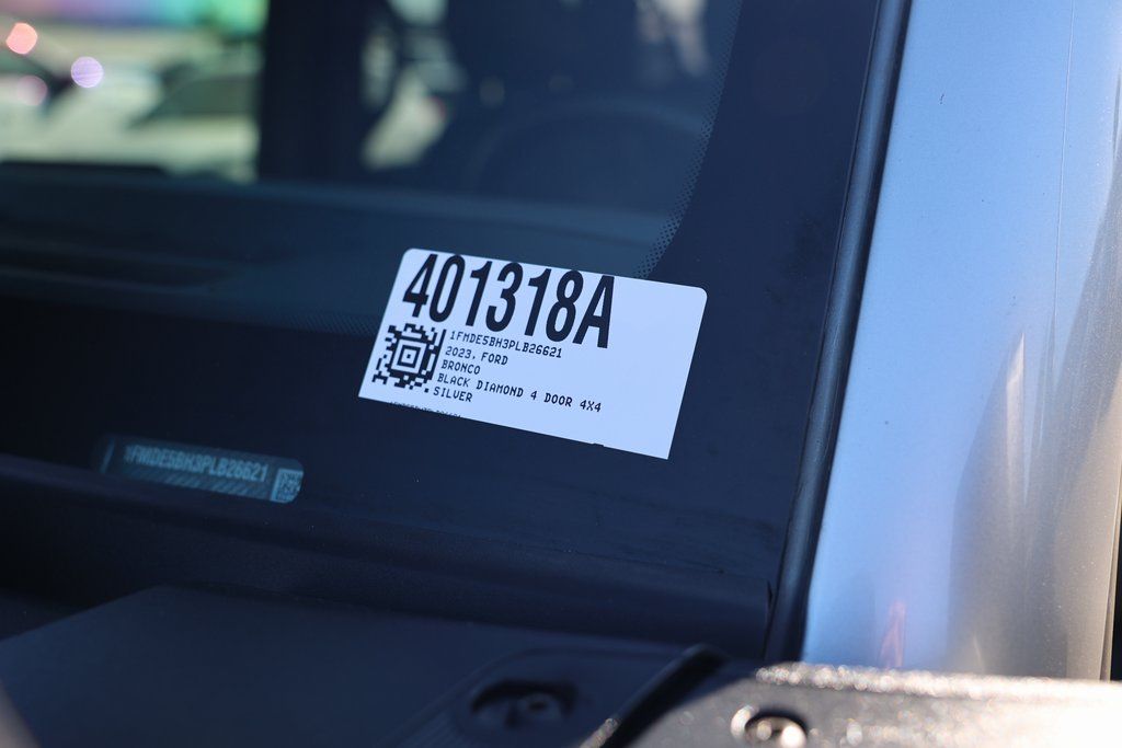 Iconic Silver Metallic 2023 Ford Bronco Black Diamond 4WD 7-Speed Manual 2.3L EcoBoost I-4 7 Speakers, ABS brakes, Air Conditioning, AM/FM radio: SiriusXM with 360L, Brake assist, Compass, Electronic Stability Control, Equipment Group 321A Standard Package, Exterior Parking Camera Rear, Front Bucket Seats, Fully automatic headlights, Heated door mirrors, Illuminated entry, Low tire pressure warning, Remote keyless entry, SiriusXM Radio w/360L, Speed control, SYNC 4, Traction control, Wheels: 17" Black Gloss-Painted Steel.
