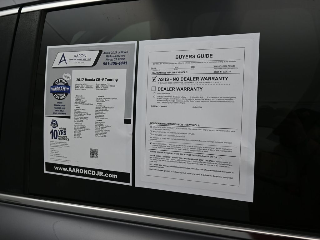 Priced below KBB Fair Purchase Price!BELOW AVERAGE ODOMETER, FRESH OIL CHANGE, NEW FILTERS, NEW WIPERS, CR-V Touring, 4D Sport Utility, 1.5L I4 DOHC 16V, FWD, 18" Alloy Wheels, Alloy wheels, Blind Spot Information (BSI) System warning, Compass, Exterior Parking Camera Rear, Front dual zone A/C, Front fog lights, Leather Seat Trim, Low tire pressure warning, Memory seat, Navigation System, Overhead airbag, Power Liftgate, Power moonroof, Tachometer.For help with any Vehicle needs please call us directly at 951-621-1288.Clean CARFAX.Awards: * JD Power Automotive Performance, Execution and Layout (APEAL) Study * 2017 KBB.com Brand Image Awards * 2017 KBB.com 10 Most Awarded BrandsKelley Blue Book Brand Image Awards are based on the Brand Watch(tm) study from Kelley Blue Book Market Intelligence. Award calculated among non-luxury shoppers. For more information, visit www.kbb.com. Kelley Blue Book is a registered trademark of Kelley Blue Book Co., Inc.