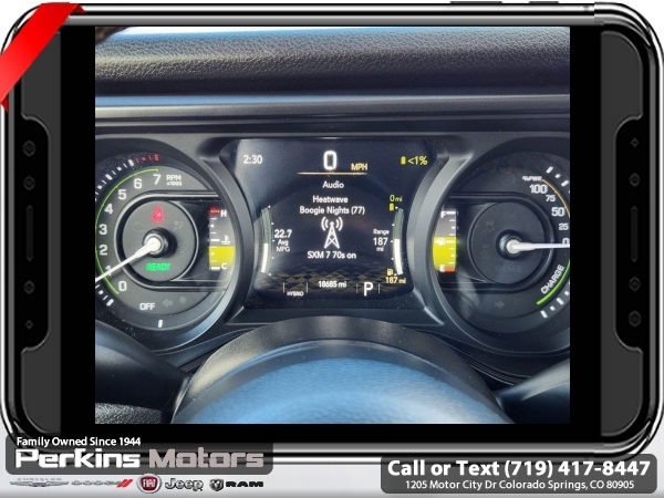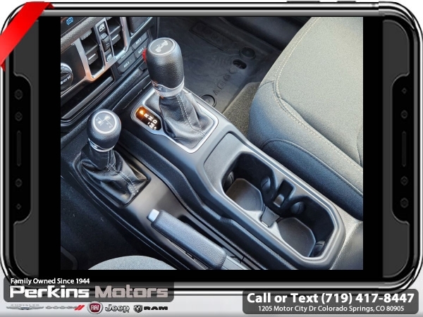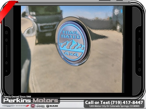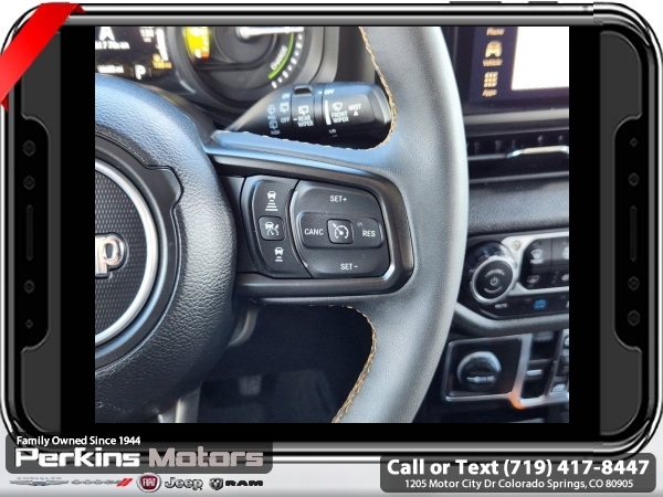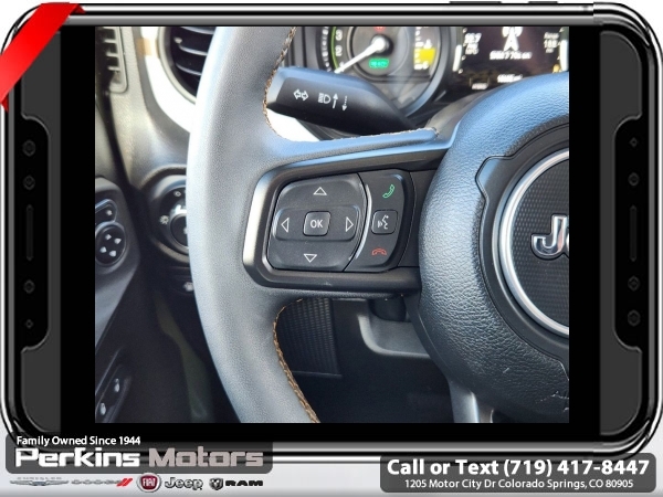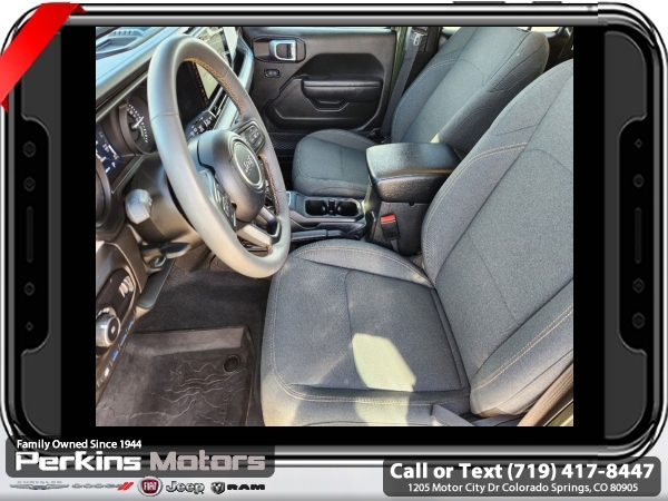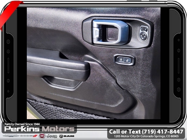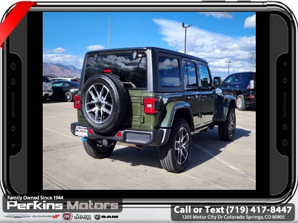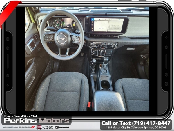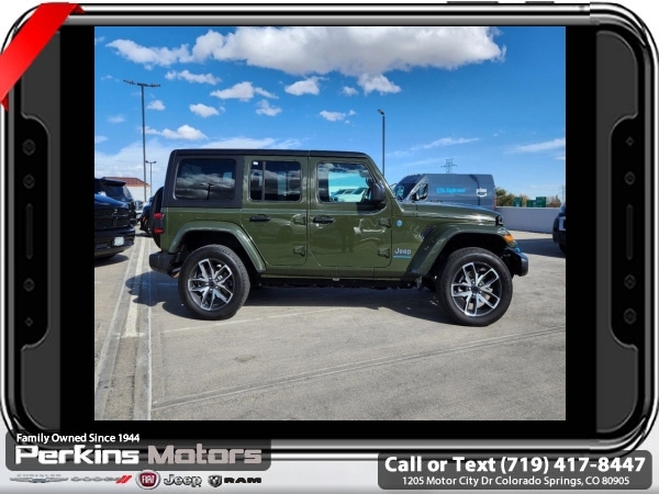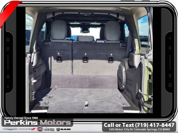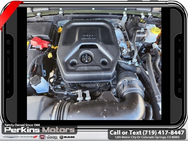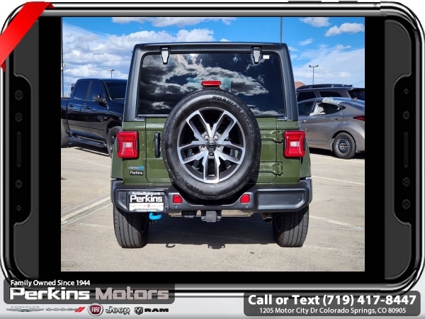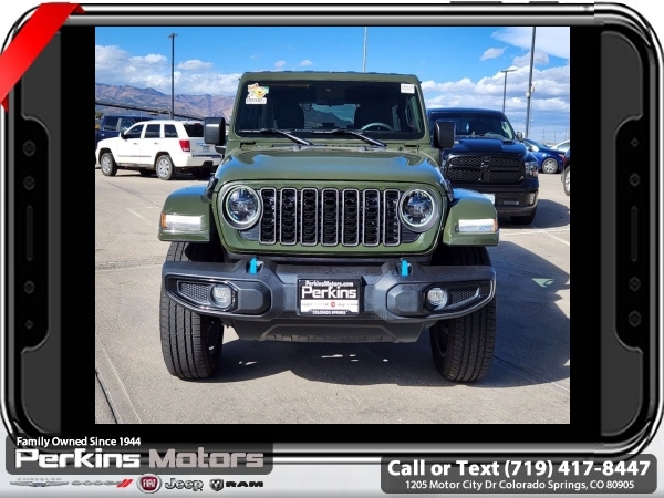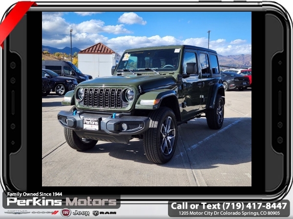 Sarge Green Clearcoat 4WD 2.0L I4 DOHC 8-Speed Automatic<br><br>2.0L I4 DOHC, 2-Door Passive Entry, Front Door Locks, 7 & 4 Pin Wiring Harness, 700 Amp Maintenance Free Battery, Alpine Premium Audio System, Auto High Beam Headlamp Control, Auxiliary Switches, Black 3-Piece Hard Top, Blind Spot & Cross Path Detection, Class II Receiver Hitch, Convenience Group, Emergency/Assistance Call, EV/PHEV Vehicle To Load, Freedom Panel Storage Bag, Heated Front Seats, Heated Steering Wheel, LED Headlamp & Fog Lamp Group, LED Taillamps, No Soft Top, ParkSense Rear Park Assist System, Quick Order Package 29U Sport S, Radio: Uconnect 5 w/12.3 Display, Rear Window Defroster, Rear Window Wiper/Washer, Remote Start System, Safety Group, Technology Group, Trailer Tow & Aux Switch Group, Universal Garage Door Opener.<br><br><br>CARFAX One-Owner. Clean CARFAX.<br><br>Check us out at www.perkinsmotors.com to see our specials! Since opening our doors in 1944, we’ve been proud to serve Colorado Springs, CO, and the surrounding areas of Pueblo, Castle Rock and Denver, CO. Throughout this time of being family owned for 80 years, we’ve maintained a firm commitment to our customers: to offer a wide selection of New Chrysler, Dodge, Fiat, Jeep, and Ram vehicles and quality pre-owned vehicles, and provide a quick, no-hassle car-buying process that ensures everyone drives off the lot satisfied with their purchase.<br><br><br>Convenience Group (2-Door Passive Entry, Front Door Locks, Emergency/Assistance Call, Heated Front Seats, Heated Steering Wheel, Remote Start System, and Universal Garage Door Opener), LED Headlamp & Fog Lamp Group, Quick Order Package 29U Sport S, Safety Group (Auto High Beam Headlamp Control, Blind Spot & Cross Path Detection, LED Taillamps, and ParkSense Rear Park Assist System), Technology Group (Alpine Premium Audio System and EV/PHEV Vehicle To Load), Trailer Tow & Aux Switch Group (7 & 4 Pin Wiring Harness, 700 Amp Maintenance Free Battery, Auxiliary Switches, and Class II Receiver Hitch), 2.0L I4 DOHC, Black 3-Piece Hard Top, Freedom Panel Storage Bag, No Soft Top, Radio: Uconnect 5 w/12.3 Display, Rear Window Defroster, Rear Window Wiper/Washer, 4-Wheel Disc Brakes, 8 Speakers, ABS brakes, Air Conditioning, Alloy wheels, Apple CarPlay/Android Auto, Automatic temperature control, Brake assist, Cloth Low-Back Bucket Seats, Compass, Cruise Control, Delay-off headlights, Driver door bin, Driver vanity mirror, Dual front impact airbags, Dual front side impact airbags, Electronic Stability Control, Front anti-roll bar, Front Bucket Seats, Front Center Armrest w/Storage, Front dual zone A/C, Front fog lights, Front License Plate Bracket, Front reading lights, Fully automatic headlights, Heated door mirrors, Illuminated entry, Integrated roll-over protection, Low tire pressure warning, Occupant sensing airbag, Outside temperature display, Overhead airbag, Panic alarm, ParkView Rear Back-Up Camera, Passenger door bin, Passenger vanity mirror, Power door mirrors, Power steering, Power windows, Radio data system, Rear anti-roll bar, Rear reading lights, Remote keyless entry, Security system, Split folding rear seat, Sport Suspension, Steering wheel mounted audio controls, Tachometer, Telescoping steering wheel, Tilt steering wheel, Traction control, Trip computer, Variably intermittent wipers, Voltmeter, and Wheels: 20 x 8 Machined/Painted Gray.