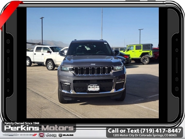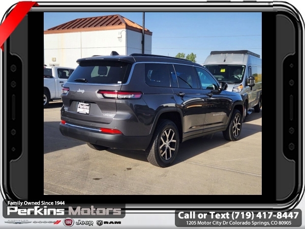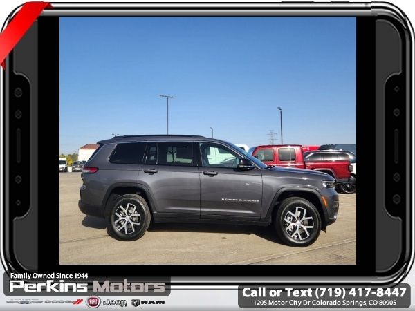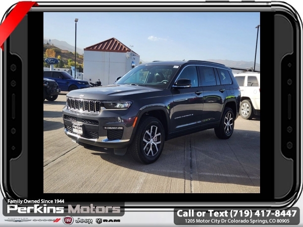 Factory MSRP: $49,295 $7,000 off MSRP! Priced below KBB Fair Purchase Price! Baltic Gray Metallic Clearcoat 2025 Jeep Grand Cherokee L Limited 4WD 8-Speed Automatic 3.6L V6 24V VVT<br><br>Check us out at www.perkinsmotors.com to see our specials! Since opening our doors in 1944, we’ve been proud to serve Colorado Springs, CO, and the surrounding areas of Pueblo, Castle Rock and Denver, CO. Throughout this time of being family owned for 80 years, we’ve maintained a firm commitment to our customers: to offer a wide selection of New Chrysler, Dodge, Fiat, Jeep, and Ram vehicles and quality pre-owned vehicles, and provide a quick, no-hassle car-buying process that ensures everyone drives off the lot satisfied with their purchase.<br><br>Quick Order Package 22E, 3.45 Rear Axle Ratio, 3rd row seats: split-bench, 4-Wheel Disc Brakes, 6 Speakers, ABS brakes, Active Noise Control System, Air Conditioning, Alloy wheels, AM/FM radio: SiriusXM with 360L, Anti-whiplash front head restraints, Audio memory, Auto High-beam Headlights, Automatic temperature control, Brake assist, Bumpers: body-color, Capri Leatherette Seats, Compass, Cruise Control, Delay-off headlights, Driver door bin, Driver vanity mirror, Dual front impact airbags, Dual front side impact airbags, Electronic Stability Control, Emergency communication system, Four wheel independent suspension, Front anti-roll bar, Front Bucket Seats, Front Center Armrest w/Storage, Front dual zone A/C, Front fog lights, Front License Plate Bracket, Front reading lights, Fully automatic headlights, Garage door transmitter, Heated door mirrors, Heated front seats, Heated rear seats, Heated steering wheel, Illuminated entry, Knee airbag, Low tire pressure warning, Manual Fold Seatbacks, Memory seat, Model Year Tracking, Navigation System, Normal Duty Suspension, Occupant sensing airbag, Outside temperature display, Overhead airbag, Overhead console, Panic alarm, ParkView Rear Back-Up Camera, Passenger door bin, Passenger vanity mirror, Power door mirrors, Power driver seat, Power Liftgate, Power passenger seat, Power steering, Power windows, Radio data system, Radio: Uconnect 5 Nav w/10.1 Display, Rear air conditioning, Rear anti-roll bar, Rear reading lights, Rear window defroster, Rear window wiper, Reclining 3rd row seat, Remote keyless entry, Security system, Speed-Sensitive Wipers, Split folding rear seat, Spoiler, Steering wheel mounted audio controls, Tachometer, Telescoping steering wheel, Tilt steering wheel, Traction control, Trip computer, Turn signal indicator mirrors, Variably intermittent wipers, Voltmeter, and Wheels: 18 x 8.0 Polished/Painted Aluminum. Sale price includes all manufacture's incentives and dealer discounts. Sale price not available on lease or compatible with special APR. $1000 - 2025 National Retail Consumer Cash. Exp. 03/03/2025 $1000 - 2025 West BC SFS Bonus Cash . Exp. 03/03/2025 $1500 - 2025 National Presidents Day Retail Bonus Cash. Exp. 03/03/2025