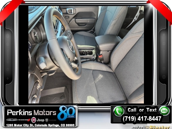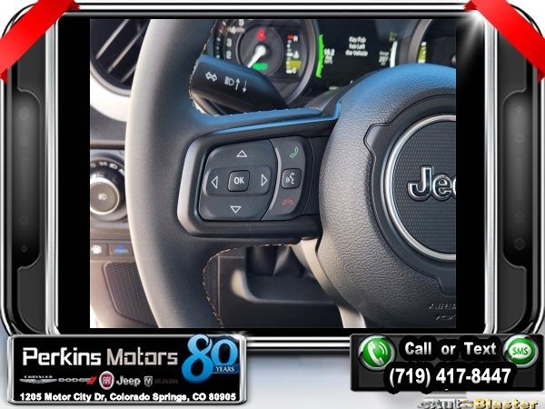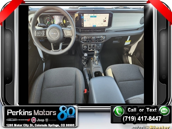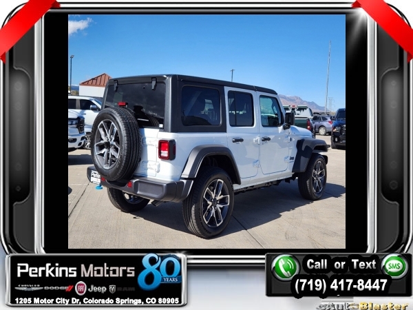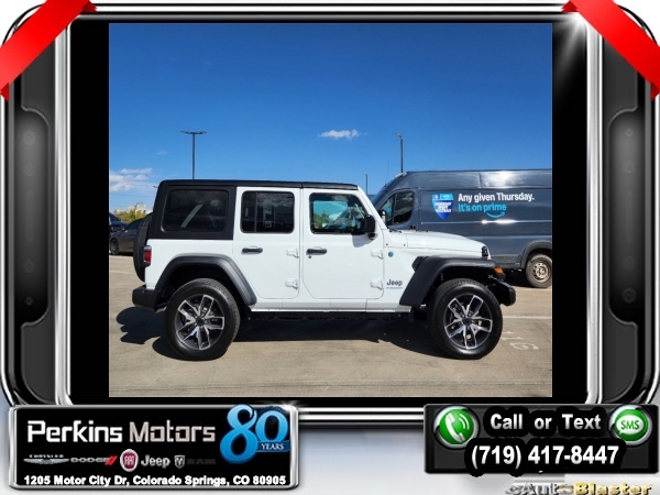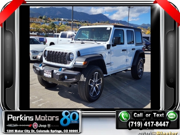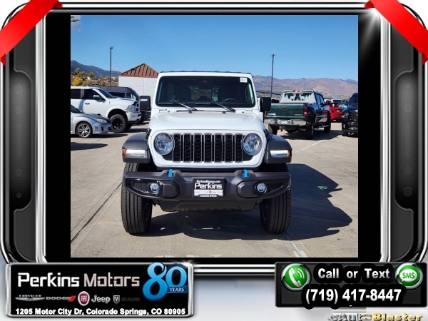 Factory MSRP: $56,450 $15,610 off MSRP! Priced below KBB Fair Purchase Price! Bright White Clearcoat 2024 Jeep Wrangler Sport S 4xe 4WD 8-Speed Automatic 2.0L I4 DOHC<br>2.0L I4 DOHC.<br>Check us out at www.perkinsmotors.com to see our specials! Since opening our doors in 1944, we’ve been proud to serve Colorado Springs, CO, and the surrounding areas of Pueblo, Castle Rock and Denver, CO. Throughout this time of being family owned for 80 years, we’ve maintained a firm commitment to our customers: to offer a wide selection of New Chrysler, Dodge, Fiat, Jeep, and Ram vehicles and quality pre-owned vehicles, and provide a quick, no-hassle car-buying process that ensures everyone drives off the lot satisfied with their purchase.<br><br>Convenience Group (Universal Garage Door Opener), Quick Order Package 29U Sport S, 2.0L I4 DOHC, 3.73 Rear Axle Ratio, 4-Wheel Disc Brakes, 8 Speakers, ABS brakes, Air Conditioning, Alloy wheels, Apple CarPlay/Android Auto, Automatic temperature control, Black 3-Piece Hard Top, Brake assist, Cloth Low-Back Bucket Seats, Compass, Cruise Control, Delay-off headlights, Driver door bin, Driver vanity mirror, Dual front impact airbags, Dual front side impact airbags, Electronic Stability Control, Front anti-roll bar, Front Bucket Seats, Front Center Armrest w/Storage, Front dual zone A/C, Front fog lights, Front License Plate Bracket, Front reading lights, Fully automatic headlights, Heated door mirrors, Illuminated entry, Integrated roll-over protection, Low tire pressure warning, MOPAR All-Weather Floor Mats, No Soft Top, Occupant sensing airbag, Outside temperature display, Overhead airbag, Panic alarm, ParkView Rear Back-Up Camera, Passenger door bin, Passenger vanity mirror, Power door mirrors, Power steering, Power windows, Radio data system, Radio: Uconnect 5 w/12.3 Display, Rear anti-roll bar, Rear reading lights, Remote keyless entry, Security system, Split folding rear seat, Sport Suspension, Steering wheel mounted audio controls, Tachometer, Telescoping steering wheel, Tilt steering wheel, Traction control, Trip computer, Variably intermittent wipers, Voltmeter, and Wheels: 20 x 8 Machined/Painted Gray. Sale price includes all manufacture's incentives and dealer discounts. Sale price not available on lease or compatible with special APR. $3750 - Federal EV Tax Credit. Exp. 12/31/2024 $500 - 2024 National Black Friday Bonus Cash . Exp. 12/02/2024 $7500 - 2024 National Retail Consumer Cash . Exp. 12/02/2024