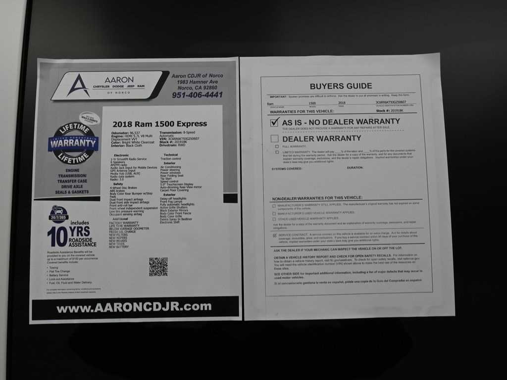 Priced below KBB Fair Purchase Price!FRESH OIL CHANGE, NEW FILTERS, NEW WIPERS, NEW TIRES, 1500 Express, 4D Crew Cab, HEMI 5.7L V8 Multi Displacement VVT, 8-Speed Automatic, RWD, 1-Yr SiriusXM Radio Service, 17" x 7" Aluminum Wheels, 40/20/40 Split Bench Seat, 5.0" Touchscreen Display, Audio Jack Input for Mobile Devices, Body Color Front Fascia, Body Color Grille, Body Color Rear Bumper w/Step Pads, Carpet Floor Covering, Center Hub, Charge Only Remote USB Port, Cloth 40/20/40 Bench Seat, Delete Class IV Receiver Hitch, Delete Spray In Bedliner, Express Value Package, For More Info, Call 800-643-2112, Front Armrest w/3 Cupholders, Front Floor Mats, Front Fog Lamps, GPS Antenna Input, Integrated Voice Command w/Bluetooth, Low tire pressure warning, Manual Adjust Seats, Media Hub (USB, AUX), No Satellite Coverage w/HI/AK/PR/VI/GU, Overhead airbag, Overhead Console, ParkView Rear Back-Up Camera, Quick Order Package 26J Express (DISC), Radio: Uconnect 3 w/5" Display, Ram 1500 Express, Rear Floor Mats, Rear Folding Seat, Rear View Day/Night Mirror, Remote Keyless Entry w/All-Secure, Remote USB Port, SiriusXM Satellite Radio, Storage Tray, Temperature & Compass Gauge, Wheels: 20" x 8" Aluminum Chrome Clad.For help with any Vehicle needs please call us directly at 951-621-1288.Clean CARFAX.CARFAX One-Owner.