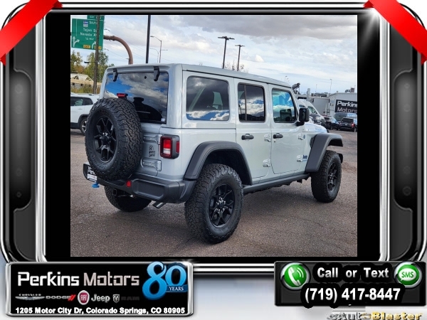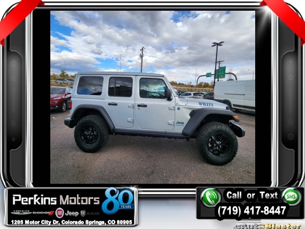 Factory MSRP: $65,210 $11,750 off MSRP! Priced below KBB Fair Purchase Price! Silver Zynith Clearcoat 2024 Jeep Wrangler Willys 4xe 4WD 8-Speed Automatic 2.0L I4 DOHC<br>2.0L I4 DOHC.<br>Check us out at www.perkinsmotors.com to see our specials! Since opening our doors in 1944, we’ve been proud to serve Colorado Springs, CO, and the surrounding areas of Pueblo, Castle Rock and Denver, CO. Throughout this time of being family owned for 80 years, we’ve maintained a firm commitment to our customers: to offer a wide selection of New Chrysler, Dodge, Fiat, Jeep, and Ram vehicles and quality pre-owned vehicles, and provide a quick, no-hassle car-buying process that ensures everyone drives off the lot satisfied with their purchase.<br><br>Convenience Group (Universal Garage Door Opener), Quick Order Package 29W Willys (97 MPH Vehicle Max Speed Calibration, Black Grille, E-Locker Rear Axle, Off-Road Plus Mode, Wheels: 17 x 7.5 Painted Black, Willy's Suspension, and Willys 4xe Hood Decal), Technology Group, 2.0L I4 DOHC, 3.73 Rear Axle Ratio, 4-Wheel Disc Brakes, 8 Speakers, ABS brakes, Air Conditioning, Alloy wheels, Apple CarPlay/Android Auto, Automatic temperature control, Brake assist, Cloth Low-Back Bucket Seats, Compass, Cruise Control, Delay-off headlights, Driver door bin, Driver vanity mirror, Dual front impact airbags, Dual front side impact airbags, Electronic Stability Control, Front anti-roll bar, Front Bucket Seats, Front Center Armrest w/Storage, Front dual zone A/C, Front fog lights, Front License Plate Bracket, Front reading lights, Fully automatic headlights, Heated door mirrors, Illuminated entry, Integrated roll-over protection, Low tire pressure warning, Occupant sensing airbag, Outside temperature display, Overhead airbag, Panic alarm, ParkView Rear Back-Up Camera, Passenger door bin, Passenger vanity mirror, Power door mirrors, Power steering, Power windows, Radio data system, Radio: Uconnect 5 w/12.3 Display, Rear anti-roll bar, Rear reading lights, Remote keyless entry, Removable Rear Quarter Windows, Security system, Sky 1-Touch Power Top, Split folding rear seat, Sport Suspension, Steering wheel mounted audio controls, Tachometer, Telescoping steering wheel, Tilt steering wheel, Traction control, Trip computer, Variably intermittent wipers, Voltmeter, and Wheels: 20 x 8 Machined/Painted Gray. Sale price includes all manufacture's incentives and dealer discounts. Sale price not available on lease or compatible with special APR. $500 - 2024 National Start Something New Bonus Cash . Exp. 02/03/2025 $7500 - 2024 National Retail Consumer Cash . Exp. 02/03/2025
