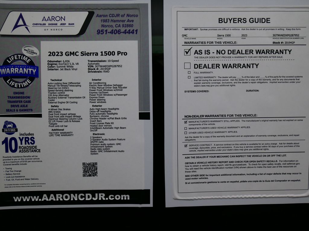 Priced below KBB Fair Purchase Price!FACTORY WARRANTY, LIFE TIME WARRANTY, Sierra 1500 Pro, 2D Standard Cab, 10-Speed Automatic, RWD, Jet Black Vinyl, 2 Charge/Data USB Ports, Air Conditioning, Apple CarPlay/Android Auto, Auto-Locking Rear Differential, Automatic Emergency Braking, Convenience Package, Cruise Control, Electric Rear-Window Defogger, Electrical Steering Column Lock, EZ Lift Power Lock & Release Tailgate, HD Rear Vision Camera, Hitch Guidance, Lane Keep Assist w/Lane Departure Warning, LED Cargo Area Lighting, Low tire pressure warning, Overhead airbag, Power Door Locks, Power Front Windows w/Driver Express Up/Down, Power Front Windows w/Passenger Express Down, Preferred Equipment Group 1SA, Premium audio system: GMC Infotainment System, Pro Value Package, Push Button Start, Remote Keyless Entry, Standard Suspension Package, Trailering Package, Wheels: 17" x 8" Bright Silver Painted Aluminum.For help with any Vehicle needs please call us directly at 951-621-1288.Clean CARFAX.