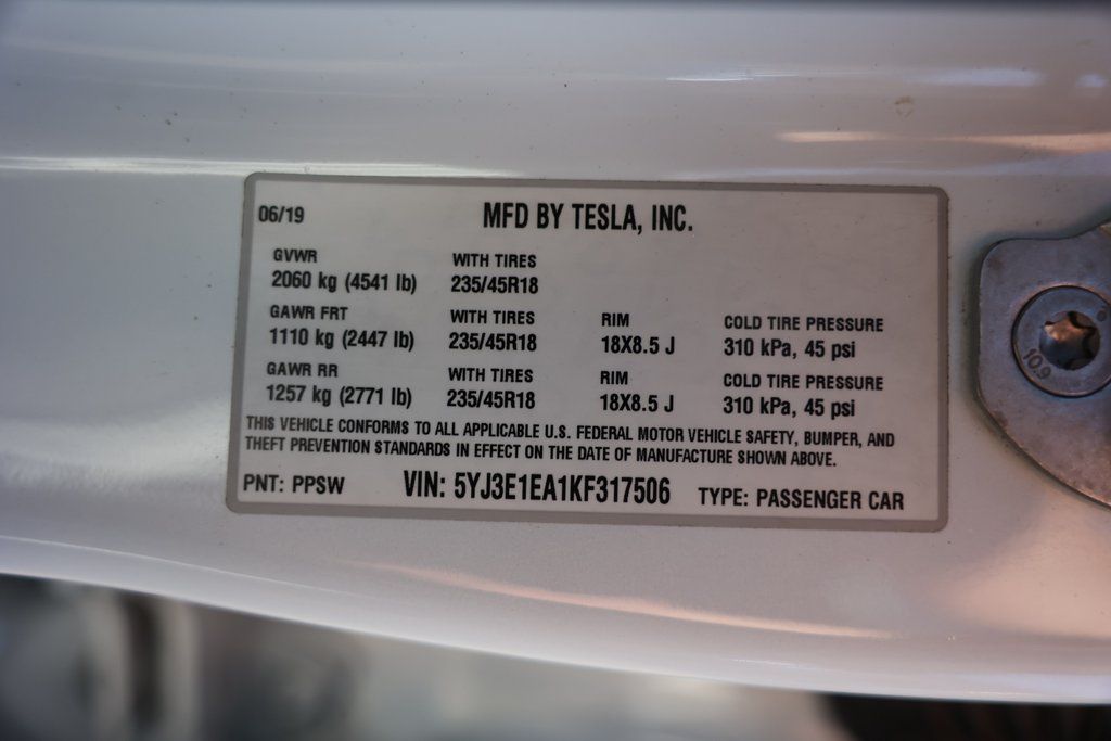 Pearl White Multi-Coat 2019 Tesla Model 3 Standard Range Plus RWD 1-Speed Automatic Electric Motor 8 Speakers, Air Conditioning, Brake assist, Electronic Stability Control, Exterior Parking Camera Rear, Front fog lights, Fully automatic headlights, Heated front seats, Memory seat, Navigation System, Premium Heated Front Bucket Seats, Premium Seat Trim, Radio: Upgraded Audio System, Security system, Speed control, Wheels: 18" Aero.Odometer is 7262 miles below market average! 140/124 City/Highway MPG