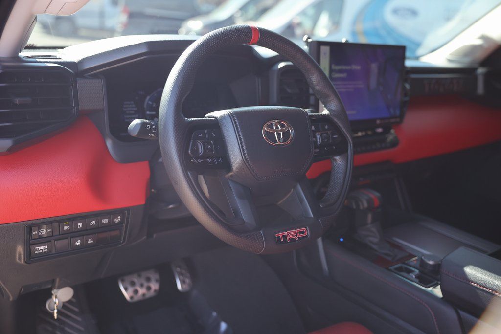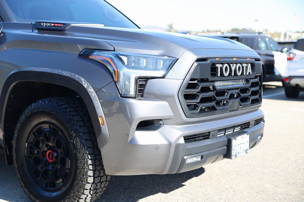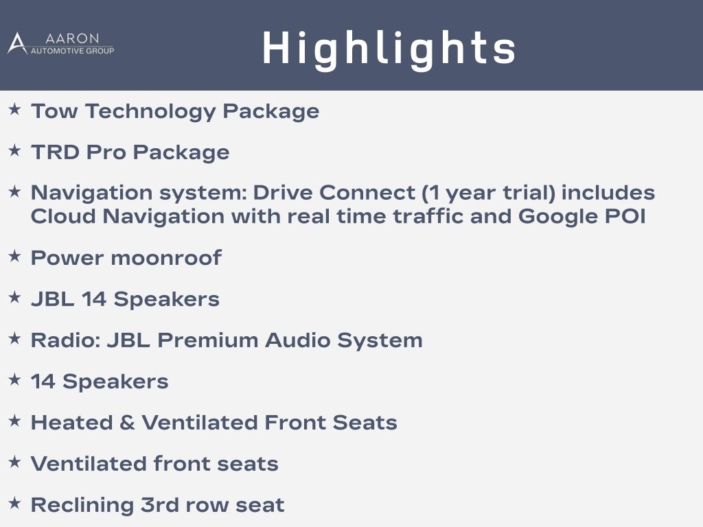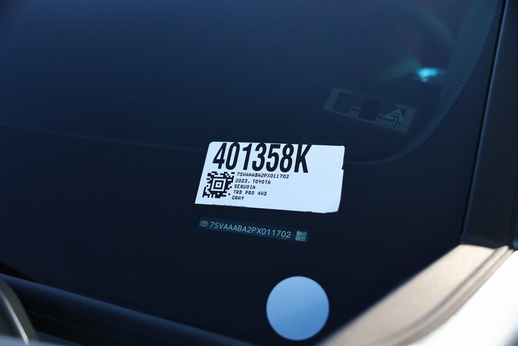 Magnetic Gray Metallic 2023 Toyota Sequoia TRD Pro 4WD 10-Speed Automatic V6 Hybrid V6 Hybrid, 10-Speed Automatic, 4WD, 14 Speakers, 3.31 Axle Ratio, Air Conditioning, Apple CarPlay/Android Auto, Brake assist, Cast Aluminum Step & Step Cover, Electronic Stability Control, Front fog lights, Fully automatic headlights, Headlight cleaning, Heated & Ventilated Front Seats, JBL 14 Speakers, Memory seat, Multi-Terrain Back Monitor, Navigation system: Drive Connect (1 year trial) includes Cloud Navigation with real time traffic and Google POI, Panic alarm, Power moonroof, Pro High Grade Full LED Headlamps, Radio: JBL Premium Audio System, Rear air conditioning, Reclining 3rd row seat, Remote keyless entry, Security system, Speed control, Tow Technology Package, TRD Pro Leather-Trimmed Steering Wheel, TRD Pro LED Light Bar, TRD Pro Package, TRD Pro Under Cover & Protector, Ventilated front seats, Wheels: 18" TRD Pro Forged-Aluminum BBS, Wireless Smartphone Charger.