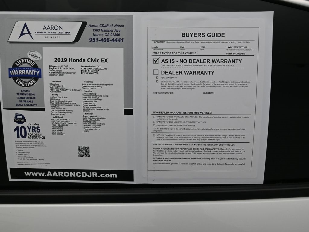 LIFE TIME WARRANTY, BELOW AVERAGE ODOMETER, FRESH OIL CHANGE, NEW FILTERS, NEW WIPERS, Civic EX, 4D Sedan, 1.5L I-4 DI DOHC Turbocharged, Black Cloth, Alloy wheels, Apple CarPlay/Android Auto, Brake assist, Electronic Stability Control, Exterior Parking Camera Rear, Forward collision: Collision Mitigation Braking System (CMBS) + FCW mitigation, Front dual zone A/C, Front fog lights, Lane departure: Lane Keeping Assist System (LKAS) active, Low tire pressure warning, Overhead airbag, Power moonroof, Spoiler.For help with any Vehicle needs please call us directly at 951-621-1288.Clean CARFAX.CARFAX One-Owner.