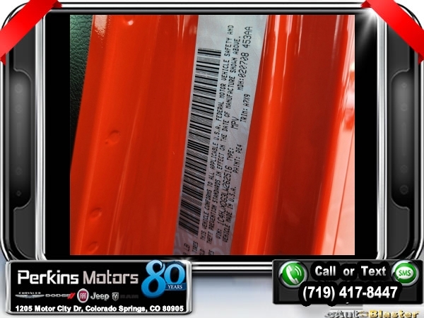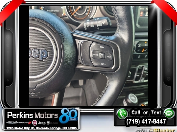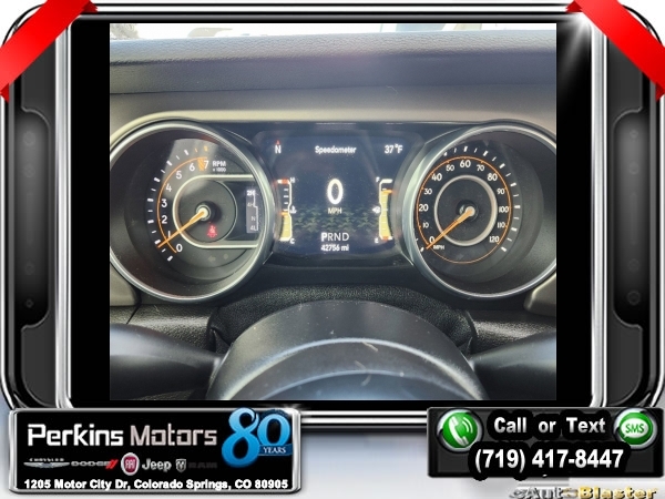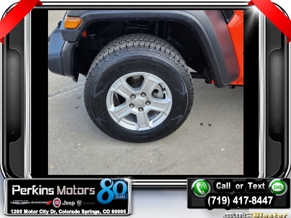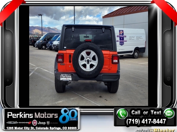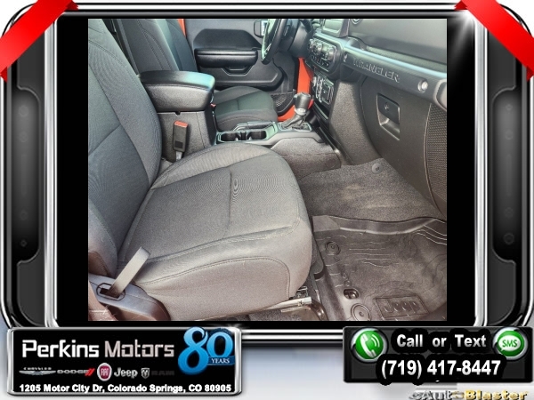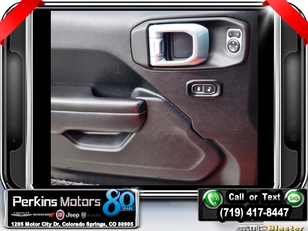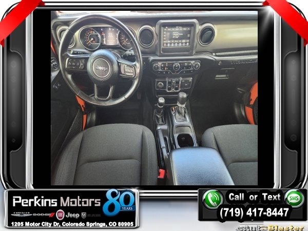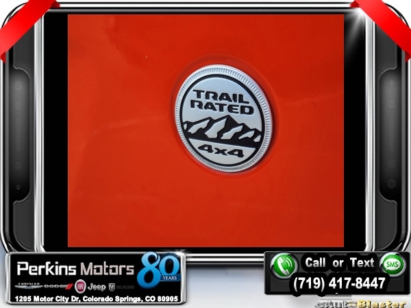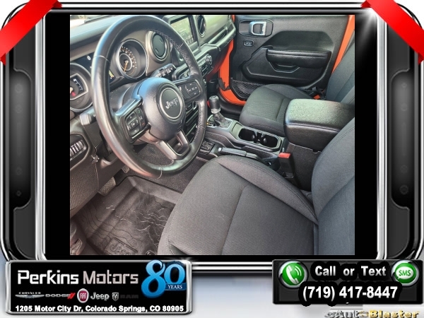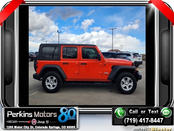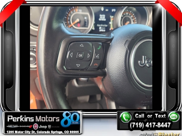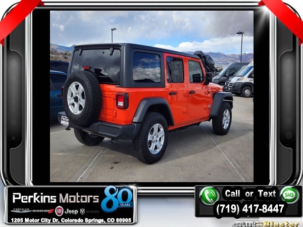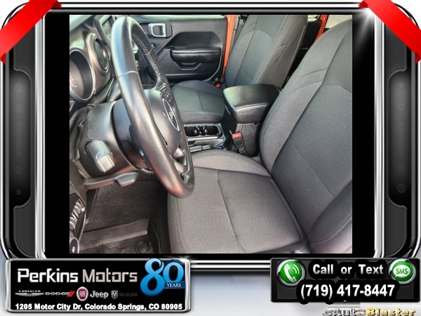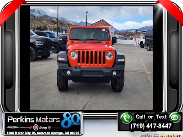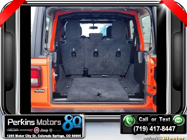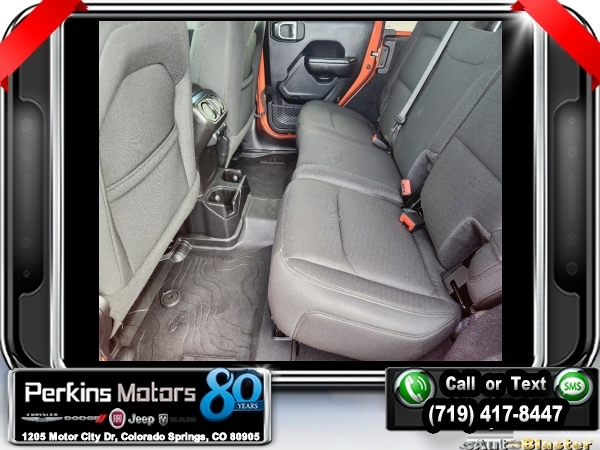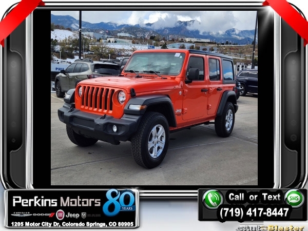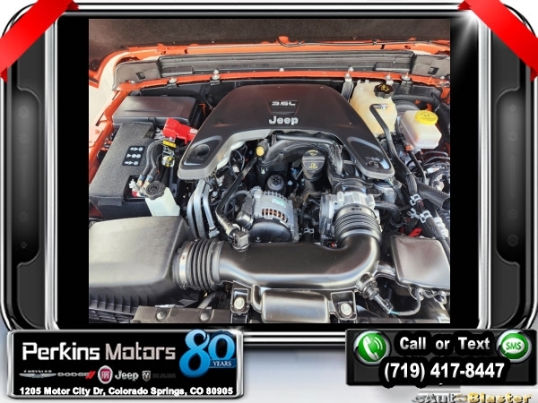 Punkn Metallic Clearcoat 4WD 3.6L V6 24V VVT 8-Speed Automatic<br><br>1-Year SiriusXM Radio Service, 7.0 Touchscreen Display, Air Conditioning w/Auto Temperature Control, Air Filtering, Apple CarPlay, Cluster 7.0 TFT Color Display, Cold Weather Group, Convenience Group, Google Android Auto, GPS Antenna Input, Heated Front Seats, Heated Steering Wheel, Integrated Center Stack Radio, Radio: Uconnect 4 w/7 Display, SiriusXM Satellite Radio, Technology Group, Universal Garage Door Opener, USB Host Flip.<br><br><br>CARFAX One-Owner. Clean CARFAX.<br><br>Check us out at www.perkinsmotors.com to see our specials! Since opening our doors in 1944, we’ve been proud to serve Colorado Springs, CO, and the surrounding areas of Pueblo, Castle Rock and Denver, CO. Throughout this time of being family owned for 80 years, we’ve maintained a firm commitment to our customers: to offer a wide selection of New Chrysler, Dodge, Fiat, Jeep, and Ram vehicles and quality pre-owned vehicles, and provide a quick, no-hassle car-buying process that ensures everyone drives off the lot satisfied with their purchase.<br><br><br>Cold Weather Group (Heated Front Seats and Heated Steering Wheel), Convenience Group (Universal Garage Door Opener), Technology Group (1-Year SiriusXM Radio Service, 7.0 Touchscreen Display, Air Conditioning w/Auto Temperature Control, Air Filtering, Apple CarPlay, Cluster 7.0 TFT Color Display, Google Android Auto, GPS Antenna Input, Integrated Center Stack Radio, Radio: Uconnect 4 w/7 Display, SiriusXM Satellite Radio, and USB Host Flip), Quick Order Package 24S Sport S (Power Heated Mirrors and Wheels: 17 x 7.5 Tech Silver Aluminum), 3.45 Rear Axle Ratio, 4-Wheel Disc Brakes, 8 Speakers, ABS brakes, Air Conditioning, AM/FM radio, Anti-Spin Differential Rear Axle, Apple CarPlay (DISC), Aux Battery, Black 3-Piece Hard Top, Brake assist, Cloth Low-Back Bucket Seats, Compass, Cruise Control, Delay-off headlights, Driver door bin, Driver vanity mirror, Dual front impact airbags, Dual front side impact airbags, Electronic Stability Control, Front anti-roll bar, Front Bucket Seats, Front Center Armrest w/Storage, Front fog lights, Front reading lights, Google Android Auto (DISC), Integrated roll-over protection, Integrated Voice Command w/Bluetooth, Low tire pressure warning, Manufacturer's Statement of Origin, MOPAR All-Weather Floor Mats, MOPAR All-Weather Floor Mats (DISC), No Soft Top, Non-Lock Fuel Cap w/o Discriminator, Normal Duty Suspension, Occupant sensing airbag, Outside temperature display, ParkView Rear Back-Up Camera, Passenger door bin, Passenger vanity mirror, Power steering, Radio data system, Radio: Uconnect 3 w/5 Display, Rear anti-roll bar, Rear reading lights, Split folding rear seat, Steering wheel mounted audio controls, Stop-Start Dual Battery System, Tachometer, Telescoping steering wheel, Tilt steering wheel, Traction control, Trip computer, Variably intermittent wipers, and Wheels: 17 x 7.5 Black Steel Styled.
