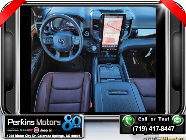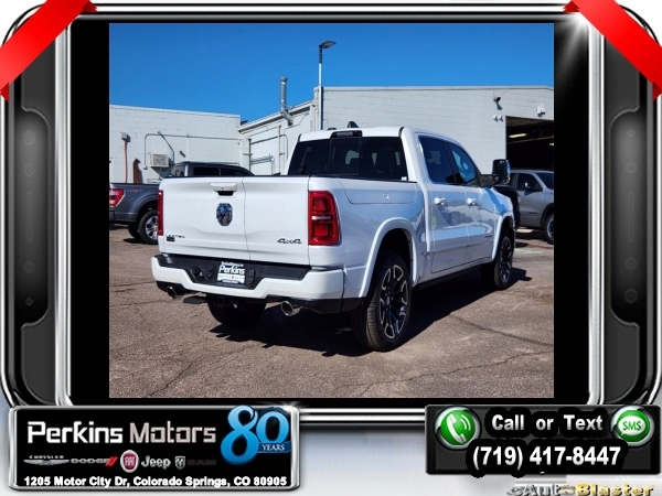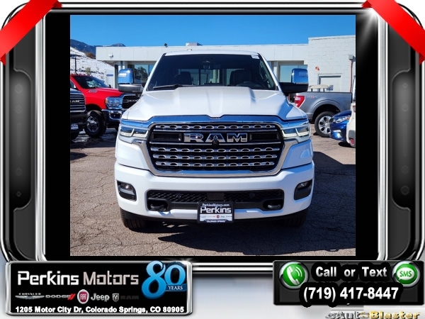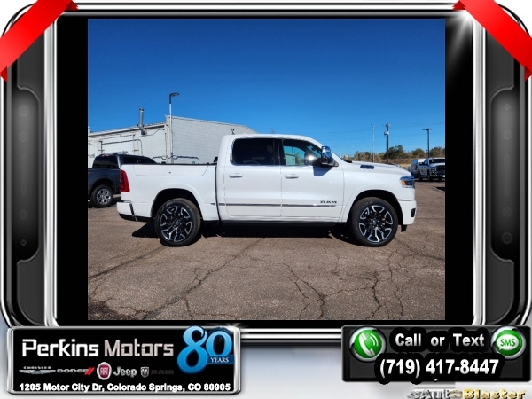 Factory MSRP: $91,070 $13,000 off MSRP! Ivory White Tri-Coat Pearlcoat 2025 Ram 1500 Limited 4WD 8-Speed Automatic 3.0L I6<br><br>Check us out at www.perkinsmotors.com to see our specials! Since opening our doors in 1944, we’ve been proud to serve Colorado Springs, CO, and the surrounding areas of Pueblo, Castle Rock and Denver, CO. Throughout this time of being family owned for 80 years, we’ve maintained a firm commitment to our customers: to offer a wide selection of New Chrysler, Dodge, Fiat, Jeep, and Ram vehicles and quality pre-owned vehicles, and provide a quick, no-hassle car-buying process that ensures everyone drives off the lot satisfied with their purchase.<br><br>Bed Utility Group (MOPAR 4 Adjustable Cargo Tie-Down Hooks and Truck Bed Cargo Divider), Body Color Bumper Group (Body Color Front Bumper and Body Color Rear Bumper w/Step Pads), Limited Level An Equipment Group (12-Way/1-Way Trailer Connector, 14.4 Touchscreen Display, 240 Amp Alternator, 4G LTE Wi-Fi Hot Spot, Apple CarPlay, Connected Travel & Traffic Services, Connectivity - US/Canada, Disassociated Touchscreen Display, Drowsy Driver Detection, Evasive Steer Assist, For Details, Visit DriveUconnect.com, Google Android Auto, GPS Antenna Input, GPS Navigation, Hands-Free Active Driving Assist System, HD Radio, Heads-Up Display, Integrated Voice Command w/Bluetooth, Intersection Collision Assist System, LED CHMSL Lamp, Radio: Uconnect 5 Nav w/14.4 Display, SiriusXM w/360L, Smartphone As A Key Capable, Surround View Camera System, Traffic Sign Recognition, Tri-Fold Tonneau Cover, and USB Host Flip), Quick Order Package 22M Limited, Towing Technology Group (Trailer Hitch Line-Up Assist), Trailer Tow Group (Trailer Brake Control, Trailer Reverse Steering Control, and Trailer Tire Pressure Monitoring System), 19 Speakers, 3.92 Rear Axle Ratio, 4-Wheel Disc Brakes, ABS brakes, Adjustable pedals, Air Conditioning, Alloy wheels, AM/FM radio: SiriusXM with 360L, Apple CarPlay/Android Auto, Audio memory, Auto High-beam Headlights, Auto Power-Folding Mirrors, Auto-dimming door mirrors, Auto-Dimming Exterior Driver Mirror, Auto-Dimming Exterior Passenger Mirror, Auto-dimming Rear-View mirror, Auto-leveling suspension, Automatic temperature control, Bodyside moldings, Brake assist, Bumpers: chrome, Chrome Exterior Mirrors, Chrome Power-Fold Trailer Tow Mirrors, Compass, Convex Wide-Angle Exterior Mirror Insert, Cruise Control, Delay-off headlights, Dome Dual LED Reading Lamp, Driver door bin, Driver vanity mirror, Dual front impact airbags, Dual front side impact airbags, Dual-Pane Panoramic Sunroof, Electronic Stability Control, Exterior 115V AC Outlet, Exterior Mirrors Courtesy Lamps, Exterior Mirrors w/Heating Element, Exterior Mirrors w/Memory, Exterior Mirrors w/Supplemental Signals, Forward & Reverse Utility Lights, Front anti-roll bar, Front Bucket Seats, Front Center Armrest w/Storage, Front dual zone A/C, Front fog lights, Front License Plate Bracket, Front reading lights, Front wheel independent suspension, Fully automatic headlights, Garage door transmitter, Genuine wood console insert, Genuine wood dashboard insert, Genuine wood door panel insert, harman/kardon® Speakers, Heated door mirrors, Heated front seats, Heated rear seats, Heated steering wheel, Illuminated entry, Leather steering wheel, LED Dome/Reading Lamp, Low tire pressure warning, Manufacturer's Statement of Origin, Memory seat, Mirror Clearance/Running Lights, Multi-Function Tailgate, Navigation System, Occupant sensing airbag, Outside temperature display, Overhead airbag, Overhead console, Panic alarm, ParkView Rear Back-Up Camera, Passenger door bin, Passenger vanity mirror, Pedal memory, Pirelli Brand Tires, Power door mirrors, P Sale price includes all manufacture's incentives and dealer discounts. Sale price not available on lease or compatible with special APR. $1000 - 2025 National Black Friday Bonus Cash . Exp. 12/02/2024 $4000 - 2025 National Retail Consumer Cash. Exp. 1