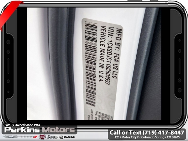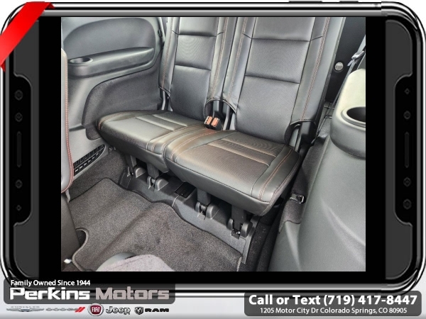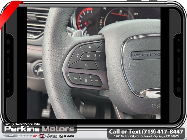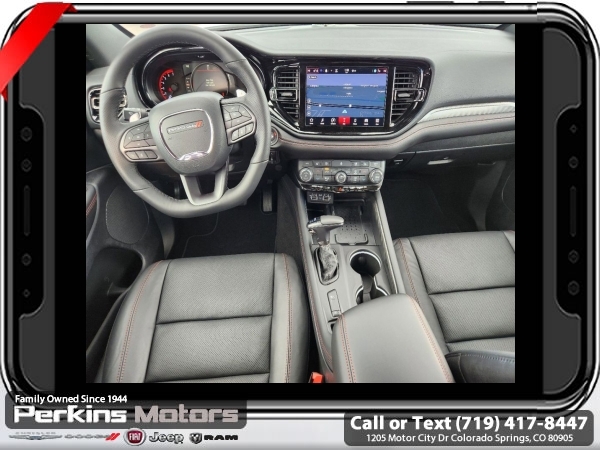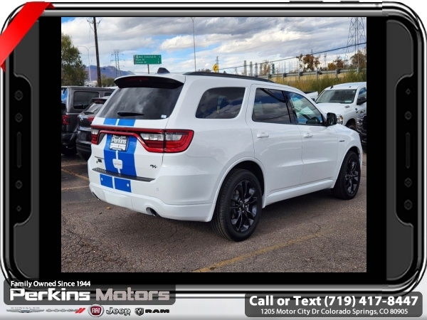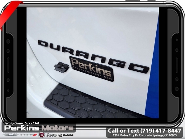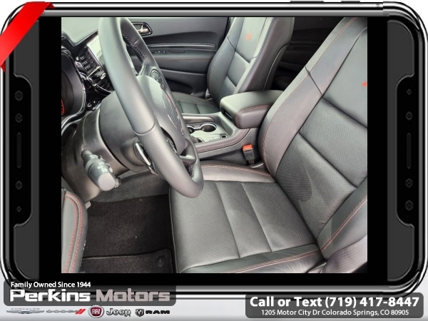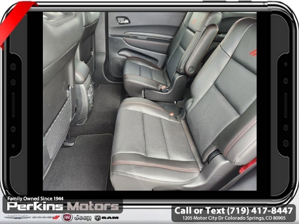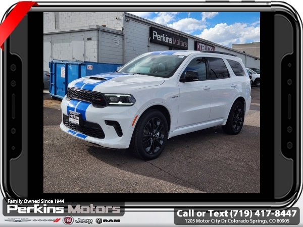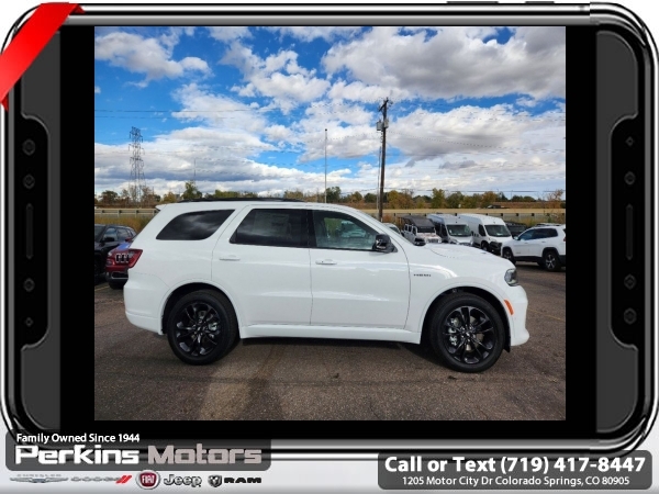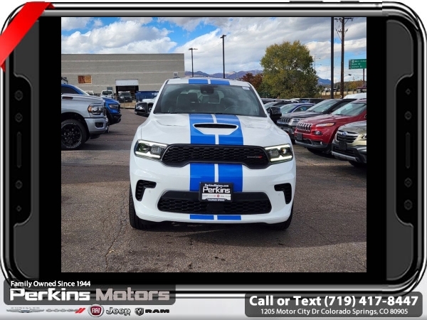 Factory MSRP: $59,175 $4,000 off MSRP! White Knuckle Clearcoat 2025 Dodge Durango R/T Plus AWD 8-Speed Automatic HEMI 5.7L V8 Multi Displacement VVT<br>AWD.<br>Check us out at www.perkinsmotors.com to see our specials! Since opening our doors in 1944, we’ve been proud to serve Colorado Springs, CO, and the surrounding areas of Pueblo, Castle Rock and Denver, CO. Throughout this time of being family owned for 80 years, we’ve maintained a firm commitment to our customers: to offer a wide selection of New Chrysler, Dodge, Fiat, Jeep, and Ram vehicles and quality pre-owned vehicles, and provide a quick, no-hassle car-buying process that ensures everyone drives off the lot satisfied with their purchase.<br><br>Blacktop Package (Black Roof Rails, Gloss Black Badges, Gloss Black Exterior Mirrors, Integrated Roof Rail Crossbars, Satin Black Dodge Tail Lamp Badge, and Wheels: 20 x 8.0 Black Noise Aluminum), Blacktop Package w/DB Black Clearcoat, Quick Order Package 22T R/T Plus (Blind Spot w/Trailer Detection, Class IV Receiver Hitch, Dual Remote USB Port - Charge Only, Exterior Mirrors w/Heating Element, Floor Console w/Leather Armrest, Full Speed Forward Collision Warning Plus, Power 6x9 Multi-Function Foldaway Mirrors, Power Sunroof, Radio/Driver Seat/Mirrors Memory, Red Accent Stitching, and Ventilated Front Seats), AWD, 2nd Row Fold/Tumble Captain Chairs, 2nd Row Mini Console w/Cupholders, 3.09 Rear Axle Ratio, 3rd Row Floor Mat & Mini Console, 3rd row seats: split-bench, 4-Wheel Disc Brakes, 6-Passenger Seating, 9 Speakers, ABS brakes, Air Conditioning, Alloy wheels, AM/FM radio: SiriusXM w/360L, Anti-whiplash front head restraints, Apple CarPlay/Android Auto, Auto-dimming Rear-View mirror, Auto-leveling suspension, Automatic temperature control, Brake assist, Bumpers: body-color, Cloth Bucket Seats w/Shift Insert, Compass, Cruise Control, Delay-off headlights, Driver door bin, Driver vanity mirror, Dual front impact airbags, Dual front side impact airbags, Electronic Stability Control, Emergency communication system: Dodge Connect, Four wheel independent suspension, Front anti-roll bar, Front Bucket Seats, Front Center Armrest w/Storage, Front dual zone A/C, Front License Plate Bracket, Front reading lights, Fully automatic headlights, Garage door transmitter, Heated door mirrors, Heated front seats, Heated steering wheel, Illuminated entry, Knee airbag, Leather steering wheel, Low tire pressure warning, MOPAR Dual Stripes- Bright Blue, Navigation System, Occupant sensing airbag, Outside temperature display, Overhead airbag, Overhead console, Panic alarm, ParkView Rear Back-Up Camera, Passenger door bin, Passenger vanity mirror, Power door mirrors, Power driver seat, Power Liftgate, Power steering, Power windows, Radio data system, Radio: Uconnect 5 Nav w/10.1 Display, Rain sensing wipers, Rear air conditioning, Rear anti-roll bar, Rear Load Leveling Suspension, Rear reading lights, Rear seat center armrest, Rear window defroster, Rear window wiper, Remote keyless entry, Security system, Speed-sensing steering, Speed-Sensitive Wipers, Split folding rear seat, Spoiler, Sport steering wheel, Steering wheel mounted audio controls, Tachometer, Telescoping steering wheel, Tilt steering wheel, Traction control, Trip computer, Variably intermittent wipers, Voltmeter, and Wheels: 20 x 8.0 Fine Silver. Sale price includes all manufacture's incentives and dealer discounts. Sale price not available on lease or compatible with special APR. $1000 - 2025 National Retail Consumer Cash. Exp. 03/31/2025