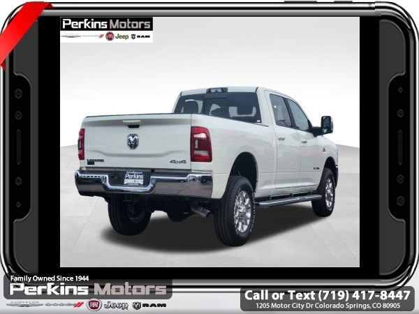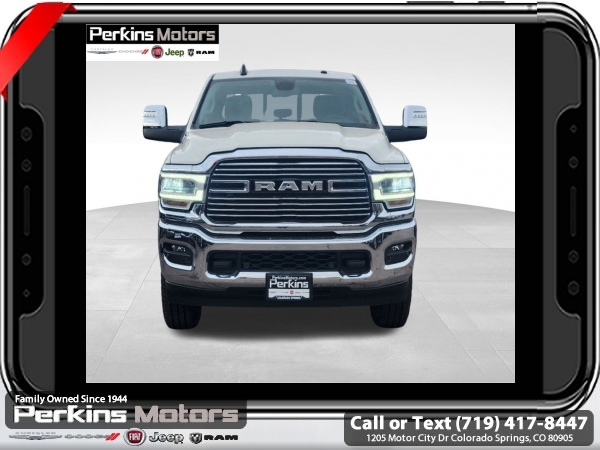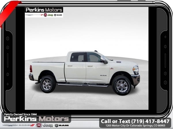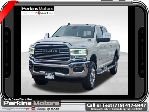 Factory MSRP: $81,455 $9,705 off MSRP! Pearl White 2024 Ram 2500 Laramie 4WD 6-Speed Automatic Cummins 6.7L I6 Turbodiesel<br><br>Check us out at www.perkinsmotors.com to see our specials! Since opening our doors in 1944, we’ve been proud to serve Colorado Springs, CO, and the surrounding areas of Pueblo, Castle Rock and Denver, CO. Throughout this time of being family owned for 80 years, we’ve maintained a firm commitment to our customers: to offer a wide selection of New Chrysler, Dodge, Fiat, Jeep, and Ram vehicles and quality pre-owned vehicles, and provide a quick, no-hassle car-buying process that ensures everyone drives off the lot satisfied with their purchase.<br><br>Chrome Bumper Package (Bright Front Bumper and Bright Rear Bumper), Cold Weather Group (Engine Block Heater and MOPAR Winter Front Grille Cover), Laramie Level B Equipment Group (12 Touchscreen Display, 17 Speaker harman/kardon Premium Sound, 2nd Row In Floor Storage Bins, 4G LTE Wi-Fi Hot Spot, Alexa Built-In, Apple CarPlay, Auto Adjust In Reverse Exterior Mirrors, Auto Dim Exterior Mirror, Auto High Beam Headlamp Control, Auto Power-Folding Mirrors, Auto-Dimming Exterior Passenger Mirror, Blind Spot & Cross Path Detection, Center Hub, Chrome Exterior Mirrors, Connected Travel & Traffic Services, Connectivity - US/Canada, Disassociated Touchscreen Display, Exterior Mirrors Courtesy Lamps, Exterior Mirrors w/Heating Element, Exterior Mirrors w/Memory, Exterior Mirrors w/Supplemental Signals, Foam Bottle Insert (Door Trim Panel), For Details, Visit DriveUconnect.com, For More Info, Call 800-643-2112, Forward & Reverse Utility Lights, Front LED Fog Lamps, Global Telematics Box Module (TBM), Google Android Auto, GPS Antenna Input, GPS Navigation, HD Radio, Heated Second Row Seats, Integrated Voice Command w/Bluetooth, LED Reflector Headlamps, LED Tail Lamps, Mirror Running Lights, Off-Road Information Pages, ParkSense Front/Rear Park Assist System, Power Adjust Mirrors, Power Adjustable Convex Aux Mirrors, Power Adjustable Pedals w/Memory, Power Heated Fold Telescopic Mirrors w/Memory, Power Telescoping Mirrors, Radio: Uconnect 5 Nav w/12.0 Display, Rain Sensitive Windshield Wipers, Rear Power Sliding Window, Rear Window Defroster, Remote Tailgate Release, Selectable Tire Fill Alert, SiriusXM Radio Service, SiriusXM w/360L, Trailer Tow Pages, and Wheels: 18 x 8.0 Polished Aluminum), Protection Group (Tow Hooks), Quick Order Package 2HH Laramie, 10 Speakers, 115V Auxiliary Rear Power Outlet, 2 Way Rear Headrest Seat, 220 Amp Alternator, 3.73 Axle Ratio, 4 Way Front Headrests, 4-Wheel Disc Brakes, 5th Wheel/Gooseneck Towing Prep Group, ABS brakes, Active Noise Control System, Air Conditioning, Alloy wheels, AM/FM radio: SiriusXM with 360L, Anti-Spin Differential Rear Axle, Apple CarPlay/Android Auto, Automatic temperature control, Brake assist, Bumpers: body-color, Chrome Flat Wheel-to-Wheel Side Steps, Compass, Cruise Control, CTR Stop Lamp w/Cargo View Camera, Delay-off headlights, Driver door bin, Driver vanity mirror, Dual front impact airbags, Dual front side impact airbags, Electronic Stability Control, Electronically Controlled Throttle, Front anti-roll bar, Front Center Armrest w/Storage, Front dual zone A/C, Front License Plate Bracket, Front reading lights, Front Seat Back Map Pockets, Fully automatic headlights, Garage door transmitter, Heated door mirrors, Heated Front Seats, Heated front seats, Heated Steering Wheel, Heated steering wheel, Illuminated entry, Leather steering wheel, Leather Trim 40/20/40 Bench Seat, Low tire pressure warning, Manufacturer's Statement of Origin, MOPAR Front & Rear Rubber Floor Mats, Navigation System, Occupant sensing airbag, Outside temperature display, Overhead airbag, Sale price includes all manufacture's incentives and dealer discounts. Sale price not available on lease or compatible with special APR. $2500 - 2024 National Truck Month Bonus Cash. Exp. 03/03/2025 Price includes $795 in dealer added a