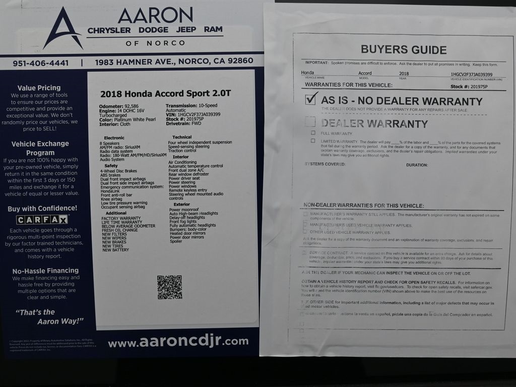 FRESH OIL CHANGE, NEW FILTERS, NEW WIPERS, Accord Sport 2.0T, 4D Sedan, I4 DOHC 16V Turbocharged, 10-Speed Automatic, FWD, Black Cloth, 8 Speakers, Alloy wheels, Apple CarPlay/Android Auto, Blind Spot Information (BSI) System warning, Front dual zone A/C, Front fog lights, Heated front seats, Knee airbag, Low tire pressure warning, Power moonroof, Radio: 180-Watt AM/FM/HD/SiriusXM Audio System, Spoiler.Awards: * JD Power Automotive Performance, Execution and Layout (APEAL) Study * ALG Residual Value Awards, Residual Value Awards * NACTOY 2018 North American Car of the Year * 2018 KBB.com 10 Most Awarded Brands * 2018 KBB.com Brand Image AwardsKelley Blue Book Brand Image Awards are based on the Brand Watch(tm) study from Kelley Blue Book Market Intelligence. Award calculated among non-luxury shoppers. For more information, visit www.kbb.com. Kelley Blue Book is a registered trademark of Kelley Blue Book Co., Inc.
