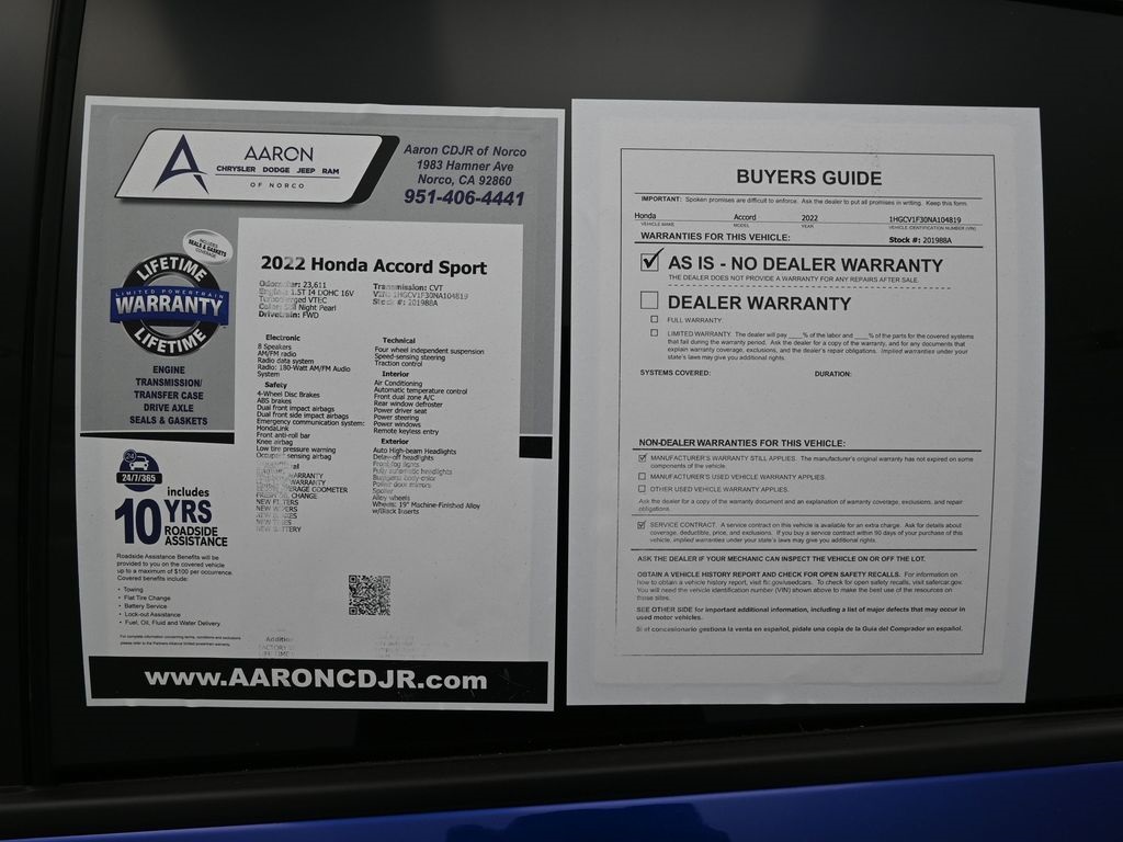 Priced below KBB Fair Purchase Price!FACTORY WARRANTY, LIFE TIME WARRANTY, BELOW AVERAGE ODOMETER, FRESH OIL CHANGE, NEW FILTERS, NEW WIPERS, NEW TIRES, Accord Sport, 4D Sedan, 1.5T I4 DOHC 16V Turbocharged VTEC, Black Artificial Leather, Adaptive Cruise Control: Adaptive CrControluise (ACC) with Low-Speed Follow, Alloy wheels, Apple CarPlay/Android Auto, Exterior Parking Camera Rear, Forward collision: Collision Mitigation Braking System (CMBS) + FCW mitigation, Front dual zone A/C, Front fog lights, Knee airbag, Lane Departure Warning System, Low tire pressure warning, Wheels: 19" Machine-Finished Alloy w/Black Inserts.Clean CARFAX.CARFAX One-Owner.