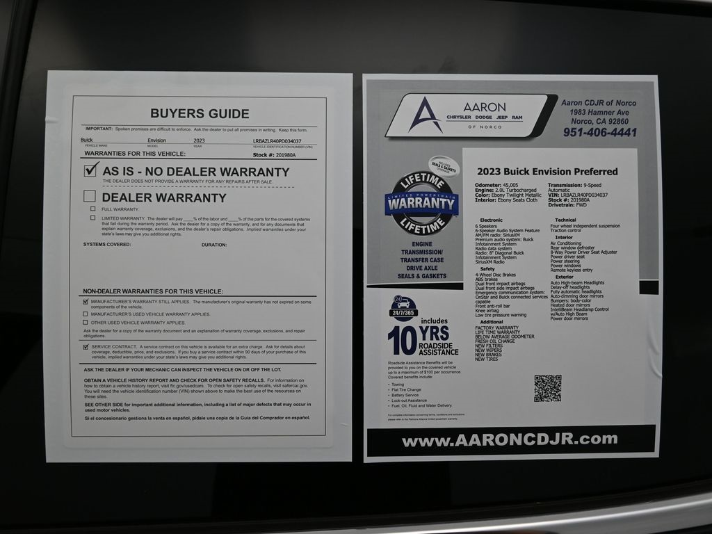 Priced below KBB Fair Purchase Price!FACTORY WARRANTY, LIFE TIME WARRANTY, BELOW AVERAGE ODOMETER, FRESH OIL CHANGE, NEW FILTERS, NEW WIPERS, NEW TIRES, Envision Preferred, 4D Sport Utility, 2.0L Turbocharged, 9-Speed Automatic, FWD, Alloy wheels, Apple CarPlay/Android Auto, Compass, Envision Driver Confidence, Knee airbag, Lane Change Alert w/Side Blind Zone Alert, Low tire pressure warning, Preferred Equipment Group 1SC, Premium audio system: Buick Infotainment System, Rear Cross Traffic Alert, Roof rack: rails only, Spoiler, USB Charging-Only Ports, Wheels: 18" Aluminum w/Light Charcoal Met Finish.For help with any Vehicle needs please call us directly at 951-621-1288.Clean CARFAX.CARFAX One-Owner.