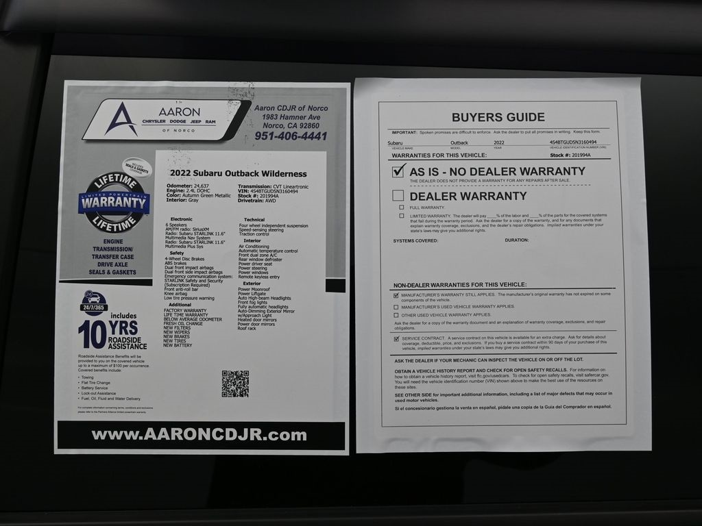 Priced below KBB Fair Purchase Price!FACTORY WARRANTY, LIFE TIME WARRANTY, BELOW AVERAGE ODOMETER, FRESH OIL CHANGE, NEW FILTERS, NEW WIPERS, Outback Wilderness, 4D Sport Utility, 2.4L DOHC, CVT Lineartronic, AWD, Alloy wheels, Auto-Dimming Exterior Mirror w/Approach Light, Cargo Sidewall Protector, Dome Light LED Upgrade, Exterior Parking Camera Rear, Front dual zone A/C, Front fog lights, Heated front seats, Heated rear seats, Knee airbag, Low tire pressure warning, Power Liftgate, Power Moonroof, Power Moonroof & Navigation & RAB, Radio: Subaru STARLINK 11.6" Multimedia Nav System, Rear Seat Back Protector, Reverse Automatic Braking (RAB) System, Splash Guards, Wilderness Package, Wireless Charger.For help with any Vehicle needs please call us directly at 951-621-1288.Clean CARFAX.CARFAX One-Owner.