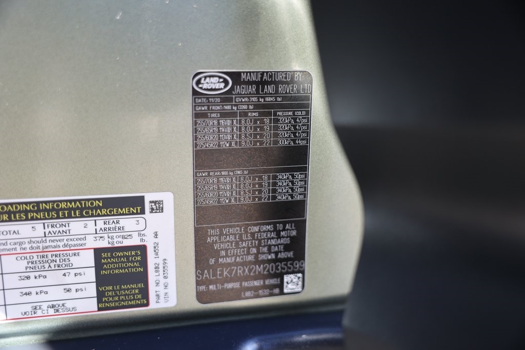 Pangea Green Metallic 2021 Land Rover Defender 110 Standard 4WD 8-Speed Automatic 2.0L Turbocharged 6 Speakers, Adaptive suspension, Air Conditioning, Apple CarPlay & Android Auto, Brake assist, Electronic Stability Control, Fabric Seat Trim, Front Bucket Seats, Fully automatic headlights, Navigation system: Connected Navigation PIVI Pro, Radio: 180W 6 Speaker Sound System, Rear fog lights, Speed control, Wheels: 20" Style 5098.Odometer is 17653 miles below market average!Awards: * Motor Trend Automobiles of the year * JD Power Automotive Performance, Execution and Layout (APEAL) Study