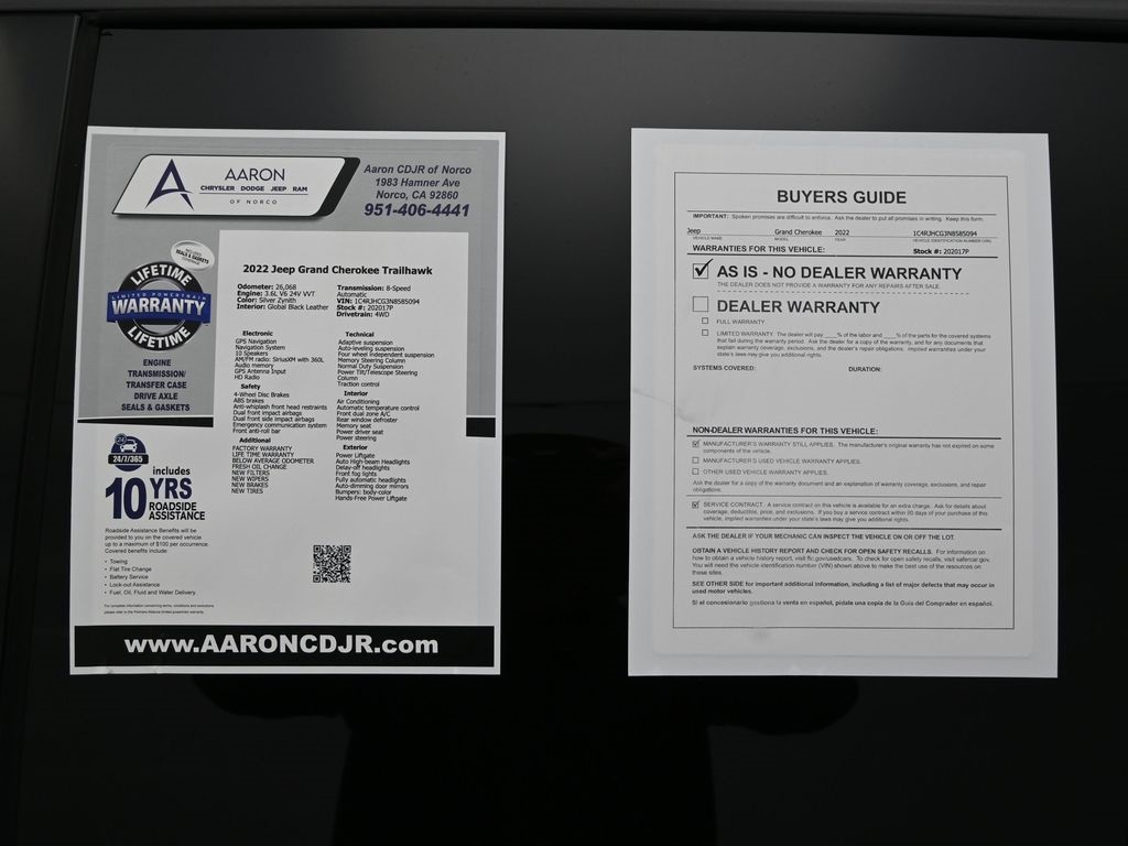 Priced below KBB Fair Purchase Price!FACTORY WARRANTY, FRESH OIL CHANGE, NEW FILTERS, NEW WIPERS, Grand Cherokee Trailhawk, 4D Sport Utility, 3.6L V6 24V VVT, 8-Speed Automatic, 4WD, Silver Zynith, 10 Speakers, 10.1" Touchscreen Display, 2nd-Row Manual Window Shades, 4G LTE Wi-Fi Hotspot, ADV Protech Group II, All Radio Equipped Vehicles, Alloy wheels, Apple CarPlay, Connected Travel & Traffic Services, Connectivity - US/Canada, Disassociated Touchscreen Display, For Details, Visit DriveUconnect.com, For More Info, Call 800-643-2112, Front dual zone A/C, Front fog lights, Front/Rear Doors & Liftgate w/Passive Entry, Global Telematics Box Module (TBM), Google Android Auto, GPS Antenna Input, GPS Navigation, Hands-Free Power Liftgate, HD Radio, Heated front seats, Heated rear seats, Integrated Center Stack Radio, Integrated Voice Command w/Bluetooth, Intersection Collision Assist System, Knee airbag, Luxury Tech Group III, Memory Steering Column, Navigation System, Night Vision w/Pedestrian-Animal Detection, Overhead airbag, Park-Sense Front & Rear Park Assist w/Stop, Power Liftgate, Power Tilt/Telescope Steering Column, Quick Order Package 22J, Radio: Uconnect 5 Nav w/10.1" Display, Radio: Uconnect 5 Nav w/8.4" Display, Rain Sensitive Windshield Wipers, Rearview Autodim Digital Display Mirror, SiriusXM Radio Service, SiriusXM Satellite Radio, SiriusXM w/360L, Surround View Camera System, USB Host Flip, Ventilated front seats, Wireless Charging Pad.