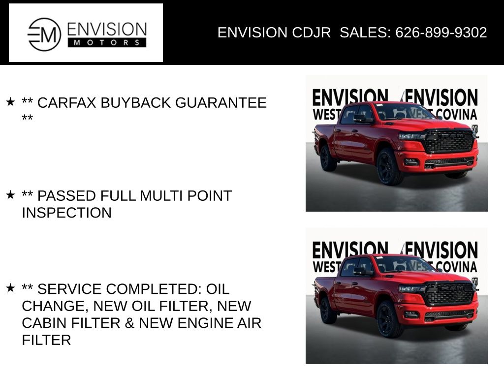** CARFAX BUYBACK GUARANTEE **, ** PASSED FULL MULTI POINT INSPECTION, ** SERVICE COMPLETED: OIL CHANGE, NEW OIL FILTER, NEW CABIN FILTER & NEW ENGINE AIR FILTER, ** FULL DETAIL INCLUDED: EXTERIOR PAINT PROTECTION, INTERIOR PROTECTION, AND WHEEL + TIRE SHINE, ** BACKUP CAMERA, ** BLUETOOTH, ** APPLE CAR PLAY/ ANDROID AUTO, 115V Auxiliary Power Outlet, 115V Auxiliary Rear Power Outlet, 12" Touchscreen Display, 2nd Row In Floor Storage Bins, 3 Rear Seat Head Restraints, 4 Way Front Headrests, 400W Inverter, 4G LTE Wi-Fi Hot Spot, 9 Amplified Speakers w/Subwoofer, Accent Color Door Handles, Accent Color Premium Power Mirrors, Air Conditioning ATC w/Dual Zone Control, Anti-Spin Differential Rear Axle, Apple CarPlay, Auto Power-Folding Mirrors, Auto-Dimming Exterior Driver Mirror, Auto-Dimming Rear-View Mirror, Bed Utility Group, Big Horn Level 2 Equipment Group, Black Exterior Mirrors, Black Exterior Truck Badging, Black Headlamp Bezels, Black Interior Accents, Black Painted Exterior Mirrors Caps, Black Premium Power Mirrors, Black Tail Lamp Bezels, Body Color Front Bumper, Body Color Rear Bumper w/Step Pads, Bucket Seats, Cluster 7.0" TFT Color Display, Configurable Drive Mode, Connected Travel & Traffic Services, Connectivity - US/Canada, Convex Wide-Angle Exterior Mirror Insert, Deluxe Cloth Bucket Seats, Dome Dual LED Reading Lamp, Dual-Pane Panoramic Sunroof, Exterior Mirrors Courtesy Lamps, Exterior Mirrors w/Heating Element, Exterior Mirrors w/Supplemental Signals, Front Seat Back Map Pockets, Full Length Floor Console, Glove Box Lamp, Google Android Auto, GPS Antenna Input, GPS Navigation, Grille Black Surround Black Mesh, HD Radio, Heated Front Seats, Heated Steering Wheel, Integrated Voice Command w/Bluetooth, Leather Wrapped Steering Wheel, LED Dome Lamp w/On/Off Switch, LED Footwell Lighting, Manual Adjust 4-Way Front Passenger Seat, Media Hub w/2 Charge Only USBs, MOPAR 4 Adjustable Cargo Tie-Down Hooks, MOPAR Spray In Bedliner, Night Edition, Overhead LED Lamps, Pick-Up Box Lighting, Power 2-Way Driver Lumbar Adjust, Power Adjust 8-Way Driver Seat, Power Adjustable Pedals, Premium Overhead Console, Quick Order Package 21Z Big Horn, Radio: Uconnect 5 Nav w/12.0" Display, RAM Grille Badge - Black, Rear 60/40 Folding Seat, Rear Center Armrest, Rear Power Sliding Window, Rear Window Defroster, Remote Tailgate Release, Security Alarm, SiriusXM w/360L, Sun Visors w/Illuminated Vanity Mirrors, Truck Bed Cargo Divider, Universal Garage Door Opener, USB Host Flip, Wheels: 20" x 9.0" Aluminum Painted Clad.Flame Red Clearcoat2025 Ram 1500 Big Horn/Lone Star 4WD 8-Speed Automatic 3.0L I6 Price includes: $1000 - 2025 West BC SFS Bonus Cash . Exp. 11/03/2025 $1000 - 2025 West BC SFS Retail Bonus Cash . Exp. 11/03/2025 $1000 - Driveability / Automobility Program. Exp. 01/05/2026 $2000 - 2025 National SFS Lease Loyalty Bonus Cash. Exp. 11/03/2025 $500 - 2025 National 2025 First Responder Bonus Cash. Exp. 01/05/2026 10% Msrp - 2025 National 10% Below MSRP . Exp. 11/03/2025