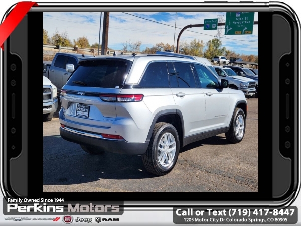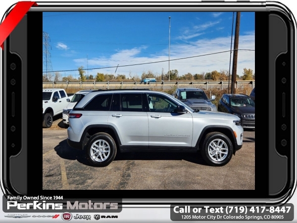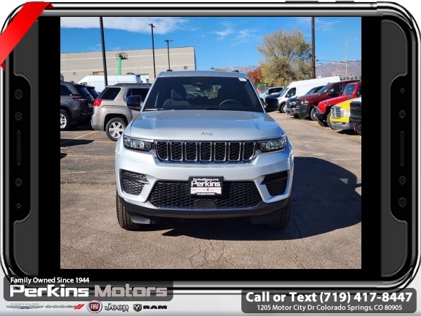 Factory MSRP: $43,970 $6,500 off MSRP! Priced below KBB Fair Purchase Price! Silver Zynith 2025 Jeep Grand Cherokee Laredo 4WD 8-Speed Automatic 3.6L V6 24V VVT<br>4WD.<br>Check us out at www.perkinsmotors.com to see our specials! Since opening our doors in 1944, we’ve been proud to serve Colorado Springs, CO, and the surrounding areas of Pueblo, Castle Rock and Denver, CO. Throughout this time of being family owned for 80 years, we’ve maintained a firm commitment to our customers: to offer a wide selection of New Chrysler, Dodge, Fiat, Jeep, and Ram vehicles and quality pre-owned vehicles, and provide a quick, no-hassle car-buying process that ensures everyone drives off the lot satisfied with their purchase.<br><br>Luxury Tech Group I (Power Liftgate, Rain Sensitive Windshield Wipers, and Wireless Charging Pad), 4WD, 4-Wheel Disc Brakes, 6 Speakers, ABS brakes, Air Conditioning, Alloy wheels, Anti-whiplash front head restraints, Automatic temperature control, Brake assist, Bumpers: body-color, Cloth Seats, Compass, Cruise Control, Delay-off headlights, Driver door bin, Driver vanity mirror, Dual front impact airbags, Dual front side impact airbags, Electronic Stability Control, Emergency communication system, Four wheel independent suspension, Front anti-roll bar, Front Bucket Seats, Front Center Armrest w/Storage, Front dual zone A/C, Front License Plate Bracket, Front reading lights, Fully automatic headlights, Heated door mirrors, Illuminated entry, Knee airbag, Low tire pressure warning, Model Year Tracking, Normal Duty Suspension, Occupant sensing airbag, Outside temperature display, Overhead airbag, Overhead console, Panic alarm, ParkView Rear Back-Up Camera, Passenger door bin, Passenger vanity mirror, Power door mirrors, Power driver seat, Power steering, Power windows, Radio data system, Radio: Uconnect 5 w/8.4 Display, Rear anti-roll bar, Rear reading lights, Rear window defroster, Rear window wiper, Remote keyless entry, Security system, Speed-Sensitive Wipers, Split folding rear seat, Spoiler, Steering wheel mounted audio controls, Tachometer, Telescoping steering wheel, Tilt steering wheel, Traction control, Trip computer, Variably intermittent wipers, Voltmeter, and Wheels: 17 x 6.5 Fully Painted Aluminum.<br><br>19/26 City/Highway MPG Sale price includes all manufacture's incentives and dealer discounts. Sale price not available on lease or compatible with special APR. $1000 - 2025 National Retail Consumer Cash. Exp. 03/03/2025 $1000 - 2025 West BC Bonus Cash . Exp. 03/03/2025 $1500 - 2025 National Presidents Day Retail Bonus Cash. Exp. 03/03/2025