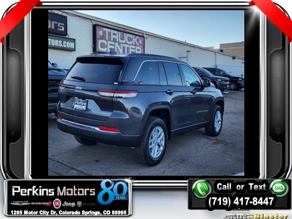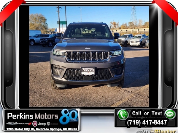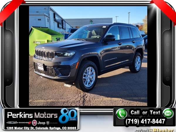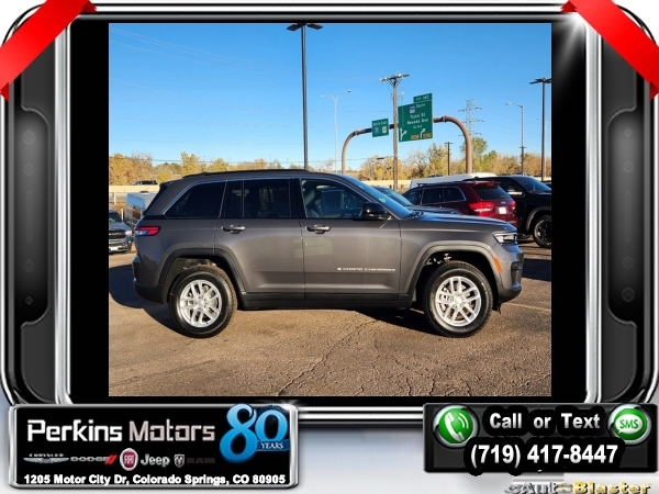 Factory MSRP: $43,970 $3,000 off MSRP! Baltic Gray Metallic Clearcoat 2025 Jeep Grand Cherokee Laredo 4WD 8-Speed Automatic 3.6L V6 24V VVT<br>4WD.<br>Check us out at www.perkinsmotors.com to see our specials! Since opening our doors in 1944, we’ve been proud to serve Colorado Springs, CO, and the surrounding areas of Pueblo, Castle Rock and Denver, CO. Throughout this time of being family owned for 80 years, we’ve maintained a firm commitment to our customers: to offer a wide selection of New Chrysler, Dodge, Fiat, Jeep, and Ram vehicles and quality pre-owned vehicles, and provide a quick, no-hassle car-buying process that ensures everyone drives off the lot satisfied with their purchase.<br><br>Luxury Tech Group I (Power Liftgate, Rain Sensitive Windshield Wipers, and Wireless Charging Pad), 4WD, 4-Wheel Disc Brakes, 6 Speakers, ABS brakes, Air Conditioning, Alloy wheels, Anti-whiplash front head restraints, Automatic temperature control, Brake assist, Bumpers: body-color, Cloth Seats, Compass, Cruise Control, Delay-off headlights, Driver door bin, Driver vanity mirror, Dual front impact airbags, Dual front side impact airbags, Electronic Stability Control, Emergency communication system, Four wheel independent suspension, Front anti-roll bar, Front Bucket Seats, Front Center Armrest w/Storage, Front dual zone A/C, Front License Plate Bracket, Front reading lights, Fully automatic headlights, Heated door mirrors, Illuminated entry, Knee airbag, Low tire pressure warning, Model Year Tracking, Normal Duty Suspension, Occupant sensing airbag, Outside temperature display, Overhead airbag, Overhead console, Panic alarm, ParkView Rear Back-Up Camera, Passenger door bin, Passenger vanity mirror, Power door mirrors, Power driver seat, Power steering, Power windows, Radio data system, Radio: Uconnect 5 w/8.4 Display, Rear anti-roll bar, Rear reading lights, Rear window defroster, Rear window wiper, Remote keyless entry, Security system, Speed-Sensitive Wipers, Split folding rear seat, Spoiler, Steering wheel mounted audio controls, Tachometer, Telescoping steering wheel, Tilt steering wheel, Traction control, Trip computer, Variably intermittent wipers, Voltmeter, and Wheels: 17 x 6.5 Fully Painted Aluminum.<br><br>19/26 City/Highway MPG