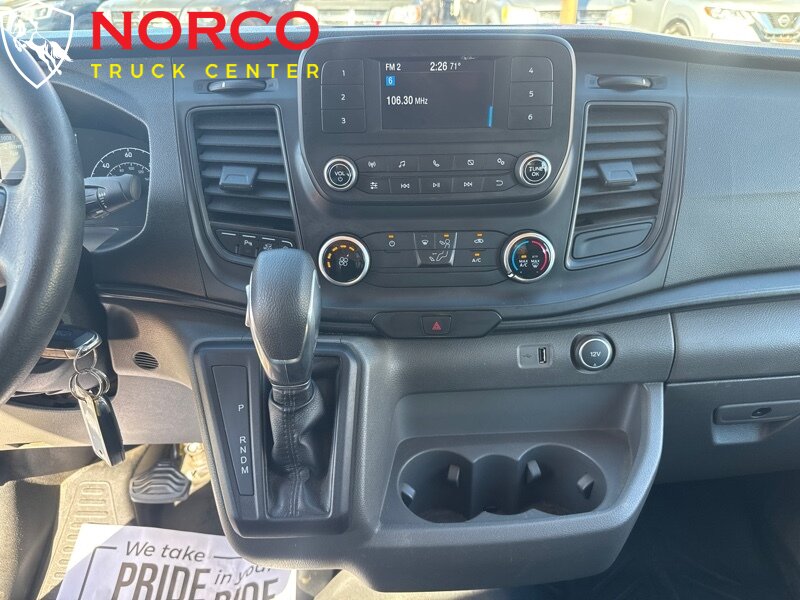 -- INSTALLED FEATURES: Front air conditioning, Front air conditioning zones: single, Airbag deactivation: passenger switch, Front airbags: dual, Side airbags: front, Side curtain airbags: front, Antenna type: mast, Auxiliary audio input: Bluetooth / USB, Radio: AM/FM, Total speakers: 4, ABS: 4-wheel, Braking assist, Cornering brake control, Electronic brakeforce distribution, Emergency braking preparation, Front brake diameter: 12.1, Front brake type: ventilated disc, Power brakes, Rear brake diameter: 12.1, Rear brake type: ventilated disc, Armrests: dual front, Floor material: rubber/vinyl, Shift knob trim: urethane, Steering wheel trim: urethane, Assist handle: front / rear, Capless fuel filler system, Cargo area light, Center console: front console with storage, Cupholders: front, Multi-function remote: keyless entry / panic alarm / trunk release, Overhead console: front, Power outlet(s): 12V front, Power steering: variable/speed-proportional, Reading lights: front, Steering wheel: tilt and telescopic, Steering wheel mounted controls: audio / multi-function / phone, Storage: cargo tie-down anchors and hooks / door pockets, Sun visors, Axle ratio: 3.73, Alternator: 250 amps, Battery: maintenance-free, Battery rating: 610 CCA, Body side moldings: black, Door handle color: black, Front bumper color: black, Grille color: black / black surround, Mirror color: black, Rear bumper color: black, Rear trunk/liftgate: barn, Side door type: passenger-side manual sliding, Window trim: black, Infotainment screen size: 4 in., Clock, Digital odometer, Gauge: tachometer, Trip odometer, Warnings and reminders: low fuel level, Headlights: auto high beam dimmer / halogen / wiper activated, Side mirror adjustments: manual folding / power, OEM roof height: medium, Automatic emergency braking: front, Camera system: rearview, Driver attention alert system, Impact sensor: door unlock / post-collision safety system, Lane deviation sensors, Pre-collision warning system: audible warning / visual warning, Rearview monitor: in dash, Front seatbelts: 3-point, Driver seat manual adjustments: reclining / 2, Front headrests: adjustable / 2, Front seat type: bucket, Passenger seat manual adjustments: reclining / 2, Upholstery: vinyl, Anti-theft system: vehicle immobilizer, Power door locks: auto-locking, Crosswind stabilization, Hill holder control, Roll stability control, Stability control, Traction control, Trailer stability control, Front shock type: gas, Front spring type: coil, Front stabilizer bar, Front struts: MacPherson, Front suspension classification: independent, Front suspension type: lower control arms, Rear shock type: gas, Rear spring type: leaf, Rear suspension classification: solid live axle, Rear suspension type: multi-leaf, Smart device app compatibility: FordPass Connect, Smart device app function: engine start / lock operation / maintenance status / vehicle location, Wi-Fi: hotspot, Wireless data link: Bluetooth, Spare tire mount location: underbody, Spare tire size: full-size, Spare wheel type: steel, Tire Pressure Monitoring System, Tire type: all season, Wheel covers: partial, Wheels: painted steel, Auxiliary transmission fluid cooler, Front wipers: rain sensing / variable intermittent, Power windows, Solar-tinted glass